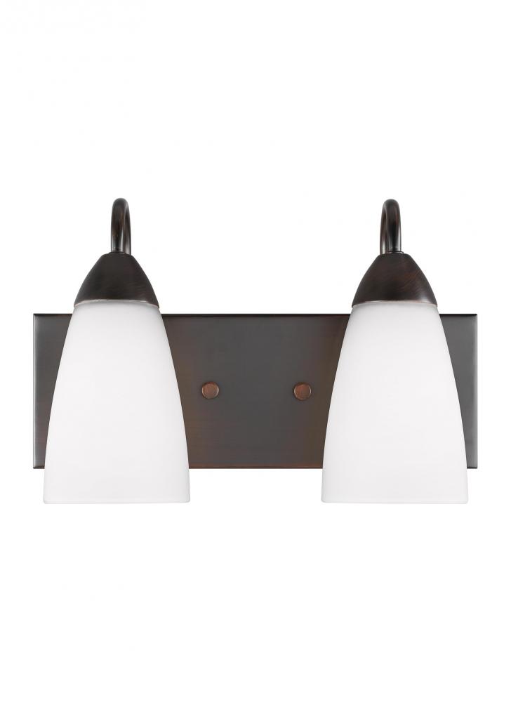 The Seville two light vanity fixture in bronze offers shadow-free lighting in your powder room, spa, or master bath room. The Seville collection represents commitment to high style at a sharp price. The modernist design is epitomized by the teardrop curves in the arms tipped by Etched glass diffusors throughout the chandeliers and bath fixtures. The collection offers a whole home lighting solution in every imaginable category. The assortment includes nine-light, five-light, and three-light chandeliers (either with up-light or down-light), pendants in four sizes as well as one-light, two-light, three-light , four-light and five-light wall/bath fixtures. Install a stylish and elegant addition to any room in the house. Seville is offered in Brushed Nickel and Burnt Sienna finishes.
