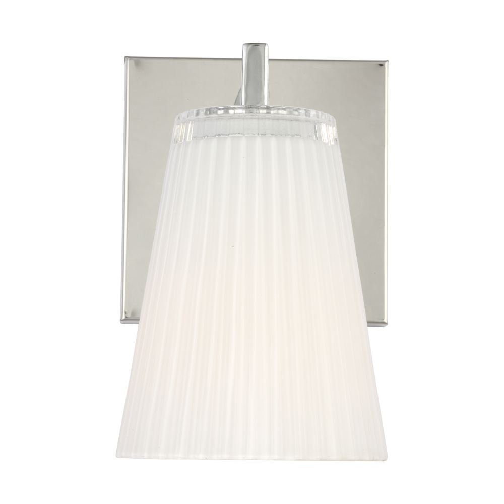 Upson features clear textured glass shades finished with a white interior that offers a soft layered glow. Available in Midnight Black, Satin Brass, Brushed Nickel, and Chrome. Upson offers flexibility in any application with one-light sconces, and two, three, and four-light vanities that are all available to be mounted up or down.