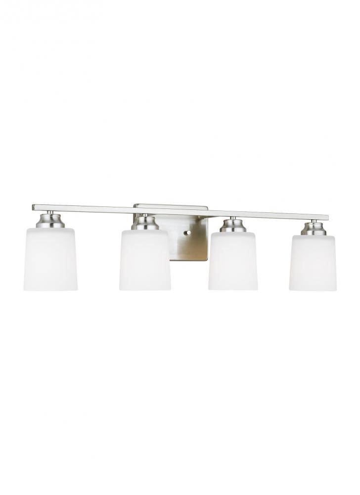 Transitional fixture in brushed nickel finish will complement bathrooms, powder rooms, bedrooms, and hallways