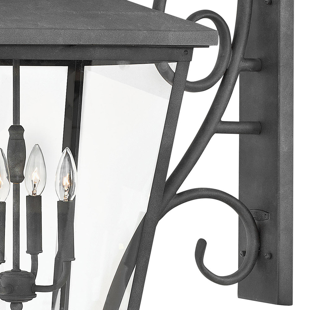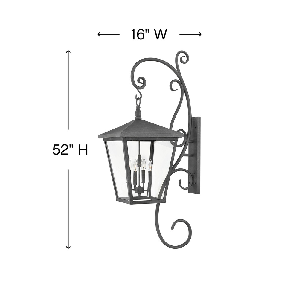 Trellis is a traditional European lantern design in an Aged Zinc finish with clear glass or Regency Bronze with clear seedy glass. The large scroll arm detail, cast loop finial and true rivet detail create a refined elegance.