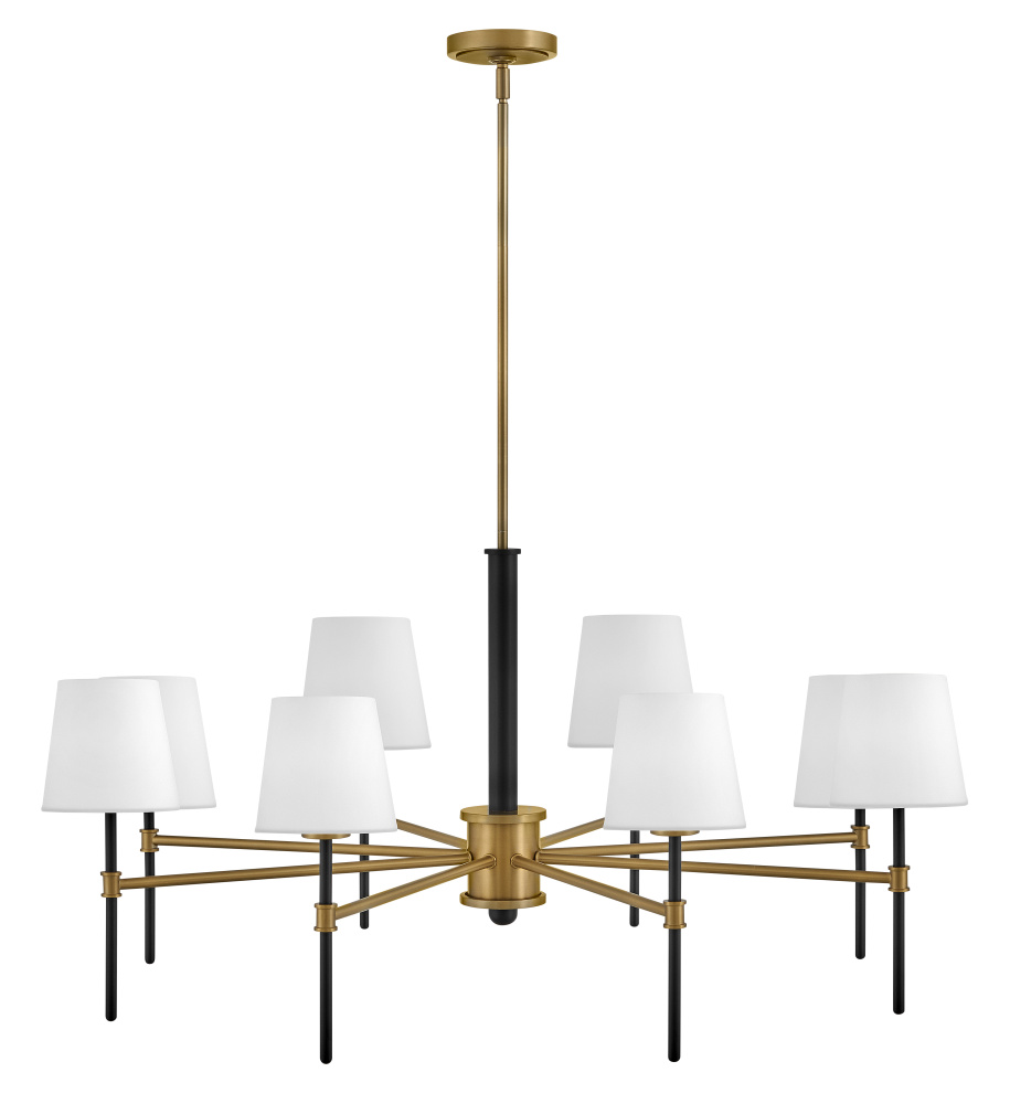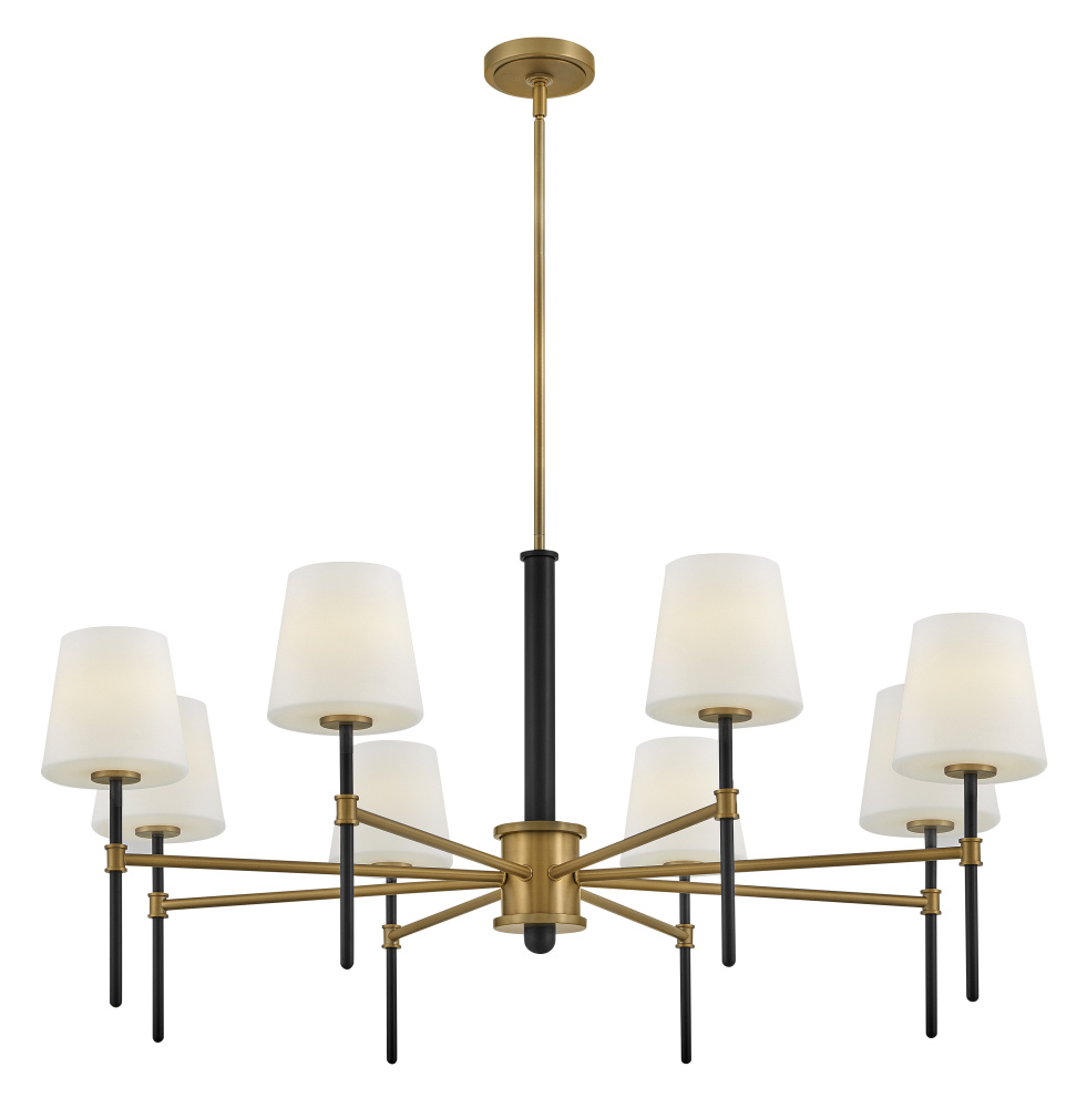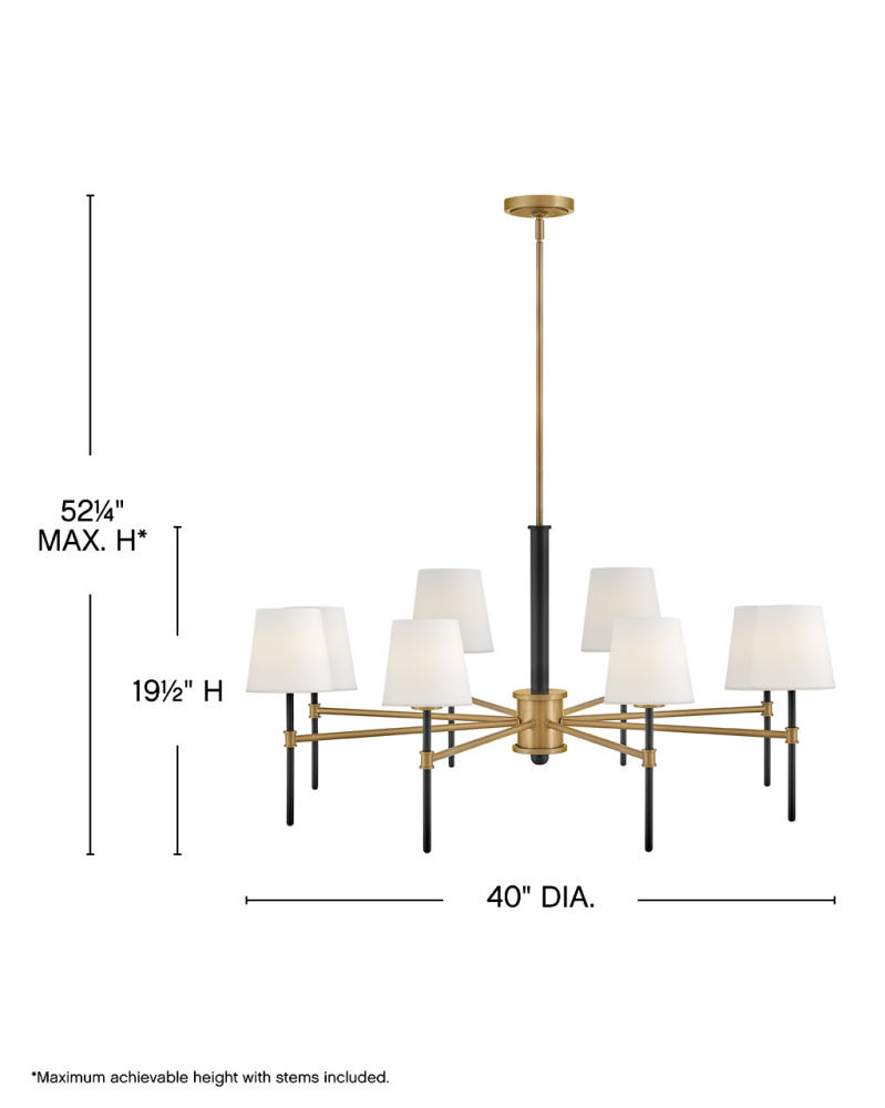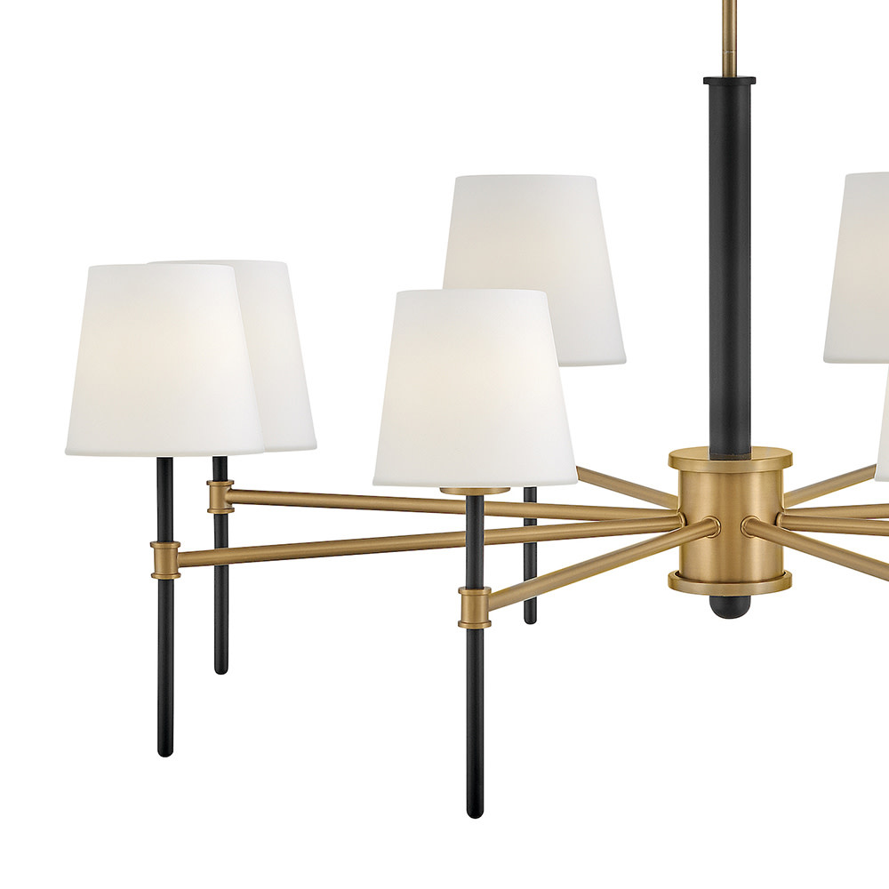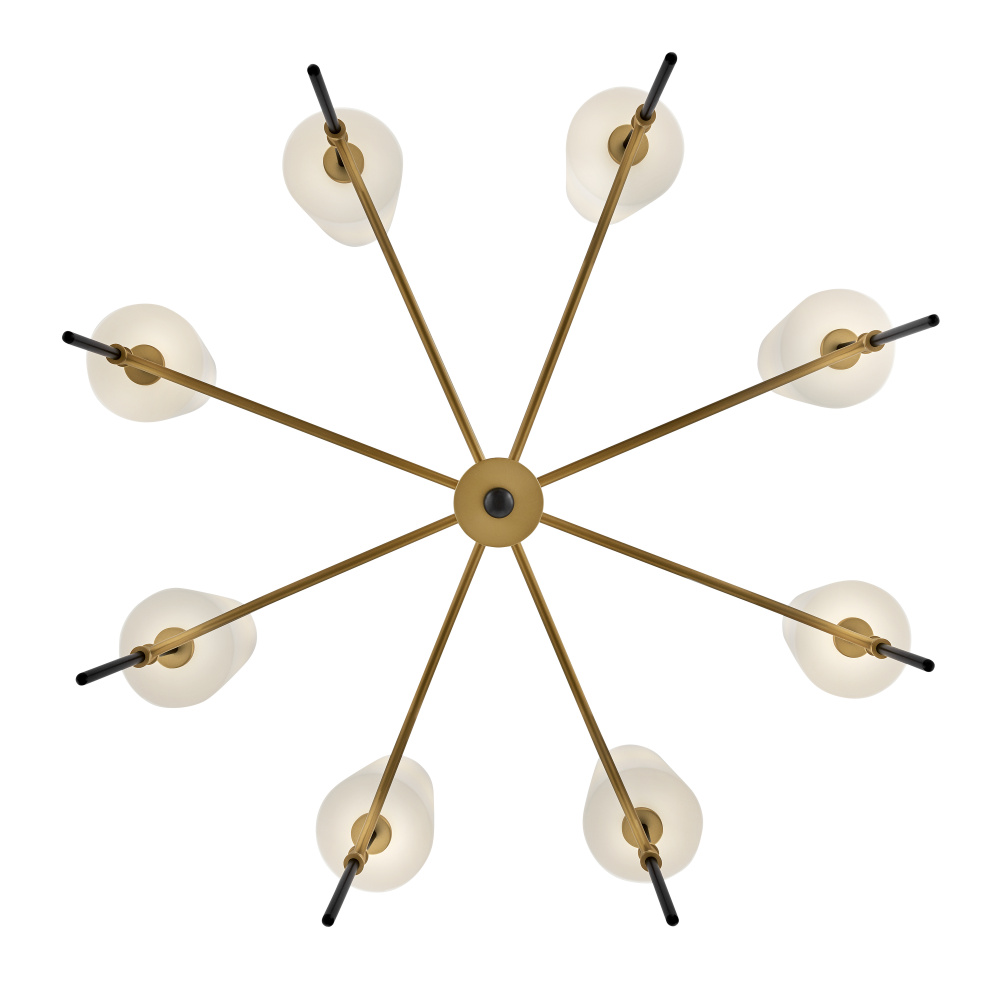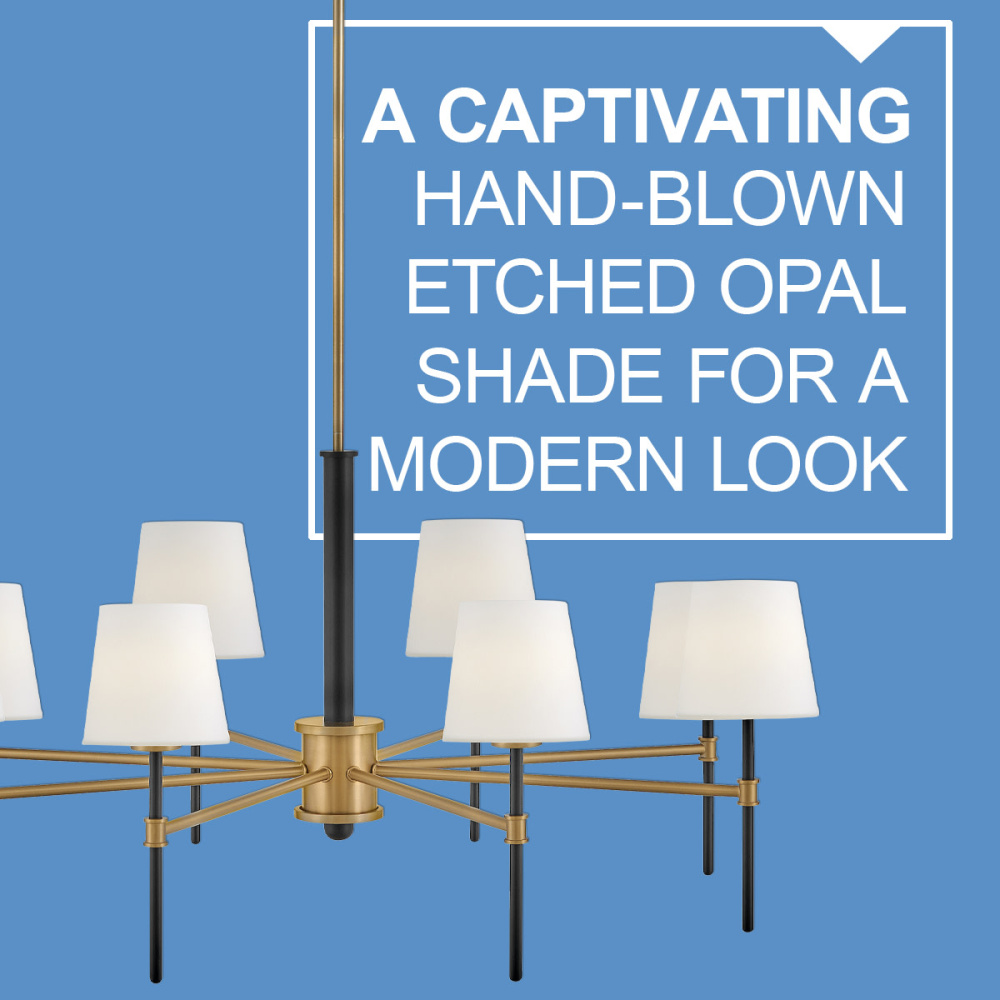 Saunders boasts a striking yet effortless appeal, blending traditional elements with captivating, mid-century modern details. A spoked silhouette and decorative stem holders are finished in Black and Lacquered Brass, paired with blown, etched opal glass shades.
