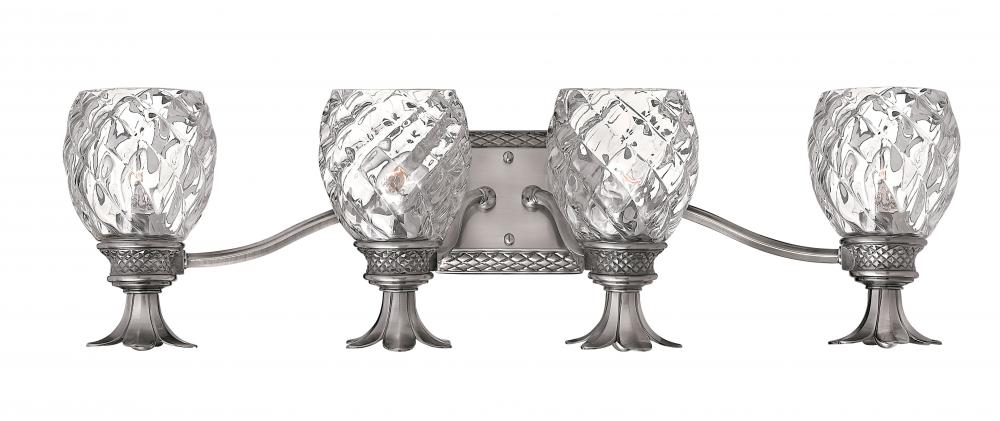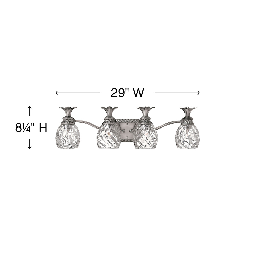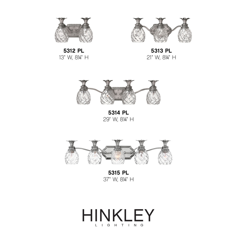 A Hinkley classic, the ornate Plantation collection features exceptional pineapple shaped, clear optic glass that makes a noble statement. The elaborate, decorative cast detailing is accentuated by its lush finish.