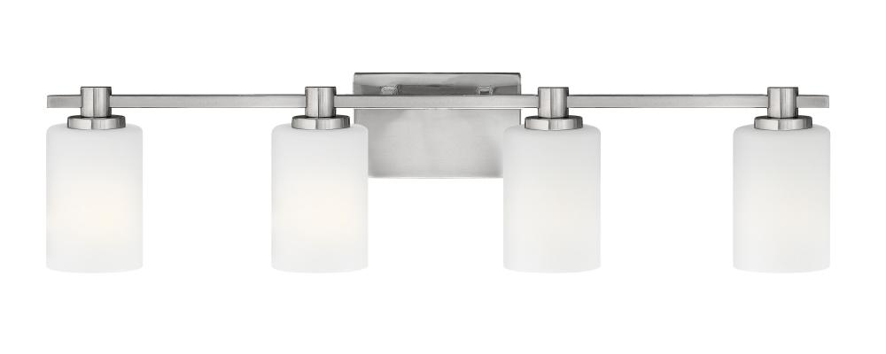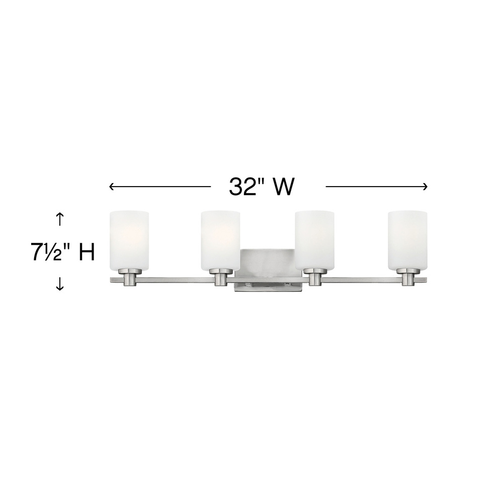 Karlie’s clean design is transitional in style and will complement a variety of décor. Featuring precision die-cast cups and cylindrical, etched opal glass, it is available in Brushed Nickel and Chrome.