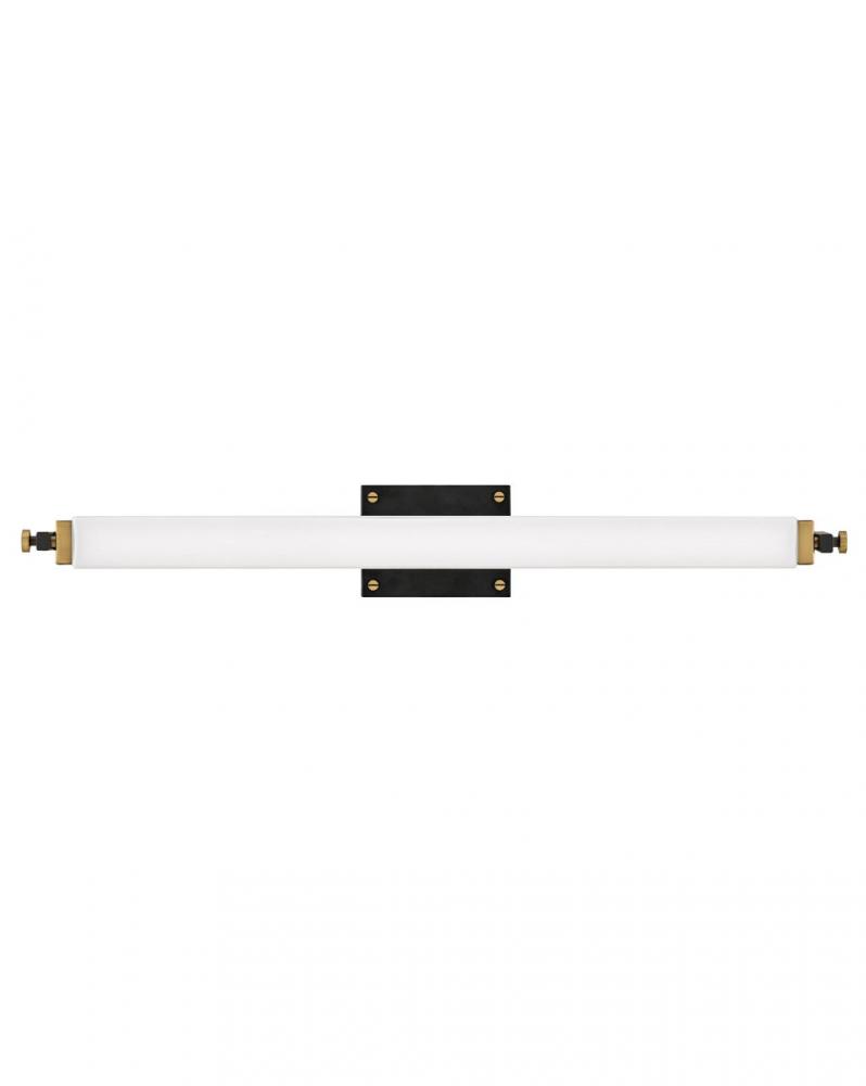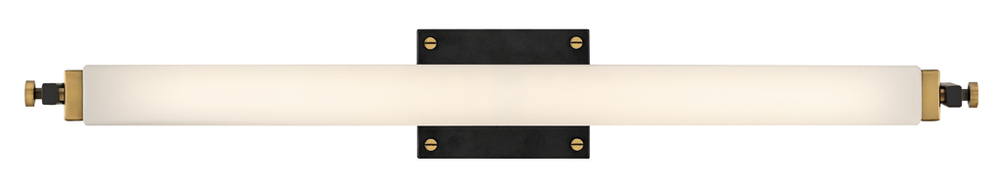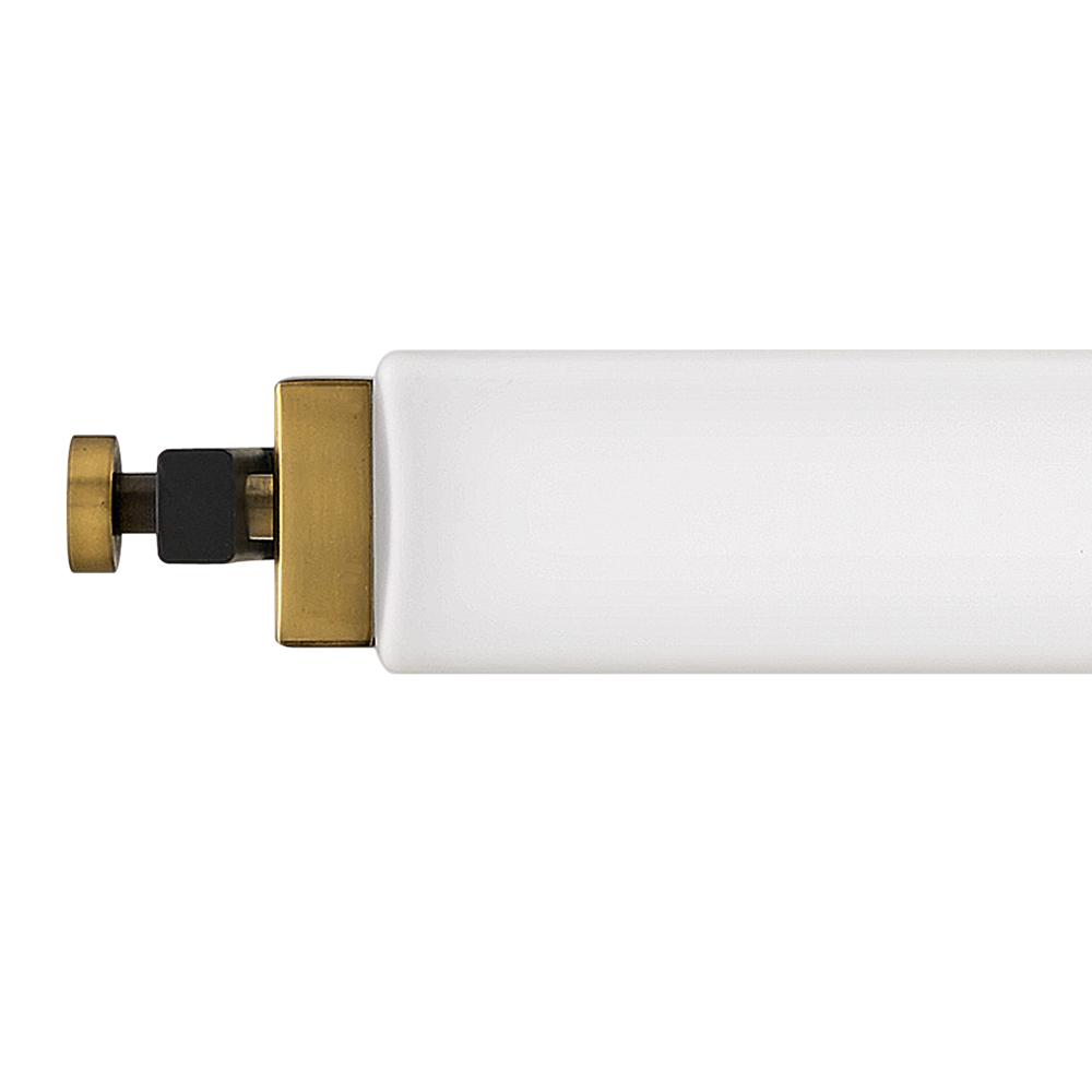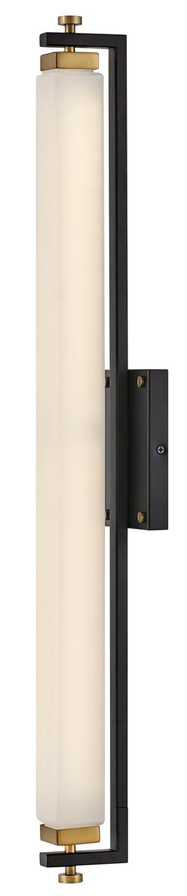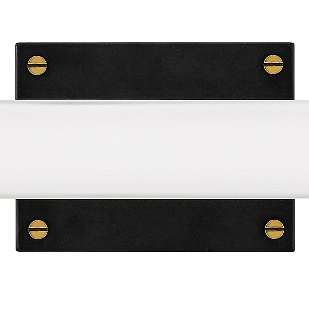 Rollins is both industrial in form and transitional in style. Unique rectangular etched opal glass has softly rounded edges offset by contrasting details on the backplate and the square knobs anchoring either end. This integrated LED design comes in two finish combinations, Black with Chrome and Black with Heritage Brass, and can be hung both vertically and horizontally.
