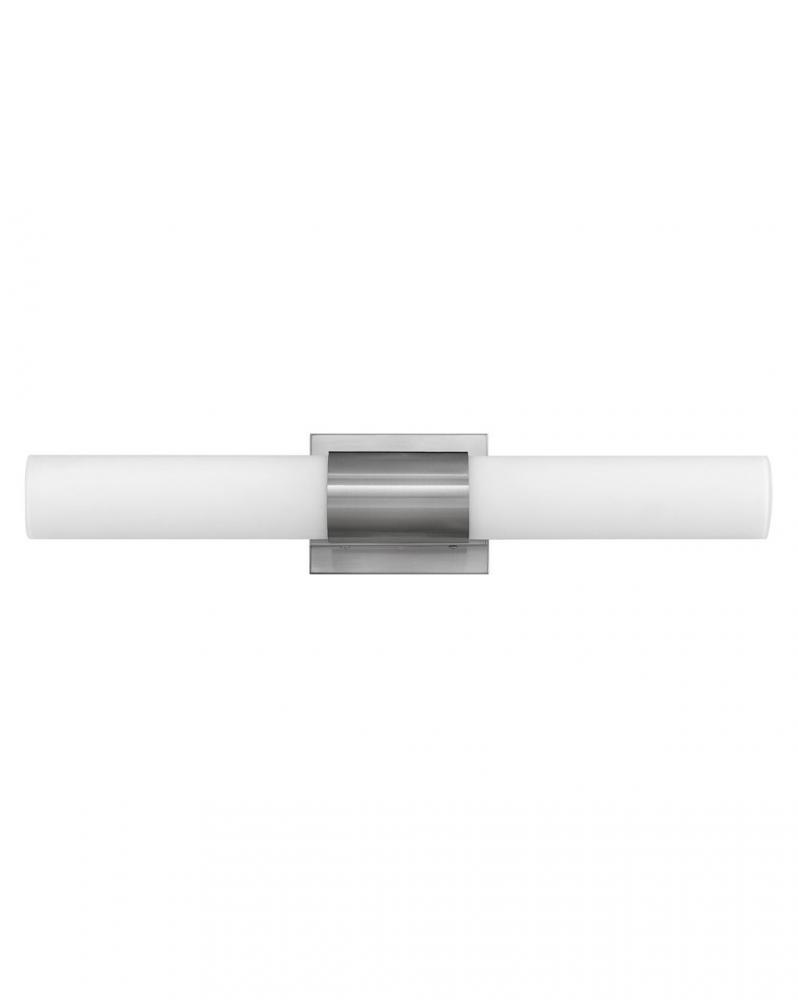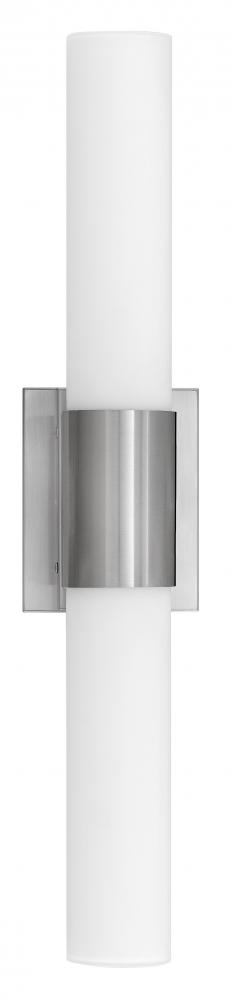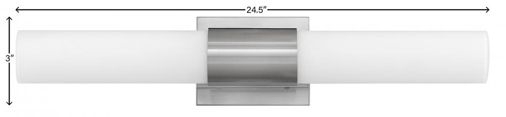 Portia's slim profile unifies design and technology. A pair of blown etched opal glass cylinders extends from a center metal fixture body, creating a streamlined cylindrical form. Finished in either Brushed Nickel or Polished Nickel, this eco-efficient linear LED collection is fully dimmable and provides even, warm white light. The raceway back plate and optional junction box cover plate provide multiple mounting opportunities.