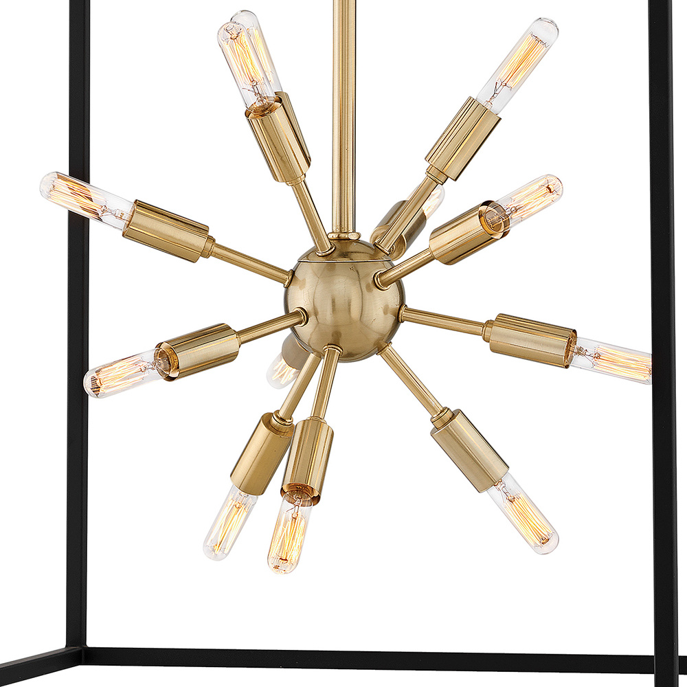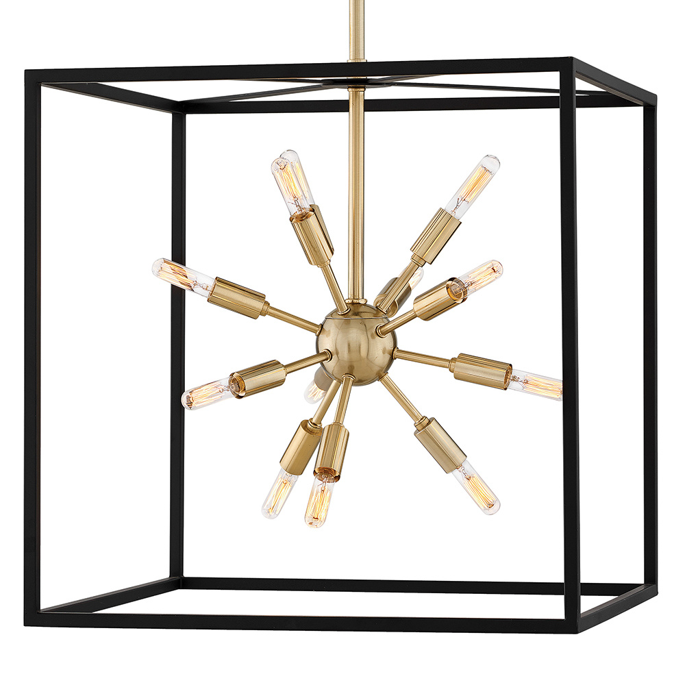The striking Aros pendant showcases a provocative mid-century modern starburst cluster in a luxurious Warm Brass or Polished Nickel framed by an articulating, angular cage in prominent Black. For added drama, the sophisticated pendants dazzle with dimension to fill unique spaces or higher ceilings. Aros is part of the Lisa McDennon Collection.