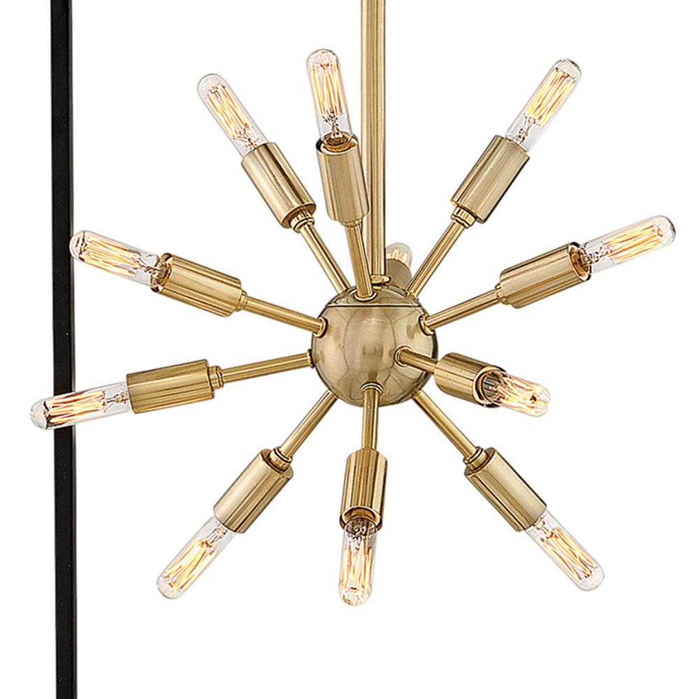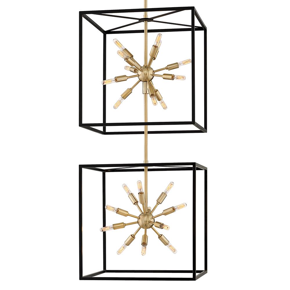 The striking Aros pendant showcases a provocative mid-century modern starburst cluster in a luxurious Warm Brass or Polished Nickel framed by an articulating, angular cage in prominent Black. For added drama, the sophisticated pendants dazzle with dimension to fill unique spaces or higher ceilings. Aros is part of the Lisa McDennon Collection.