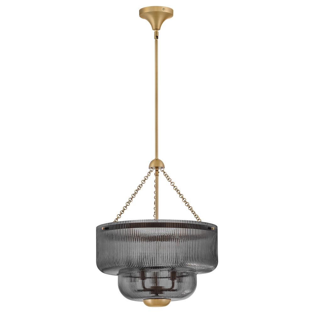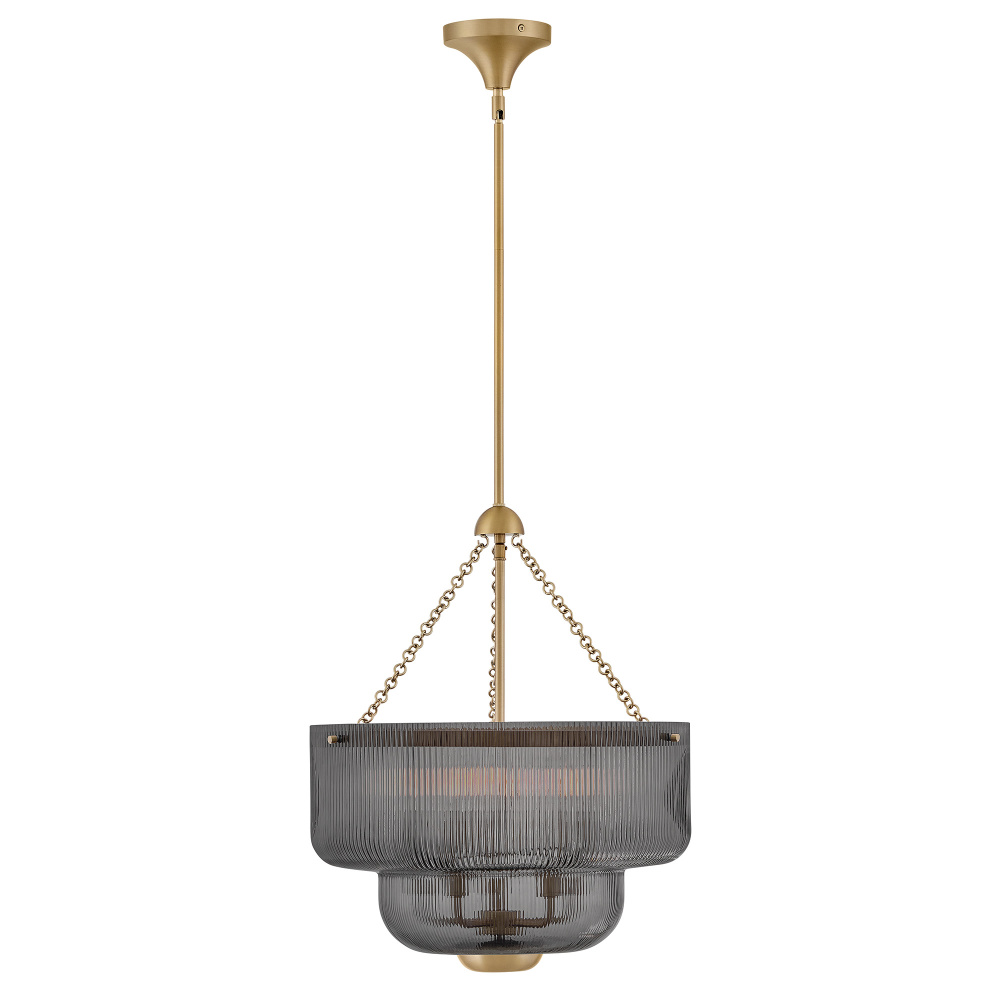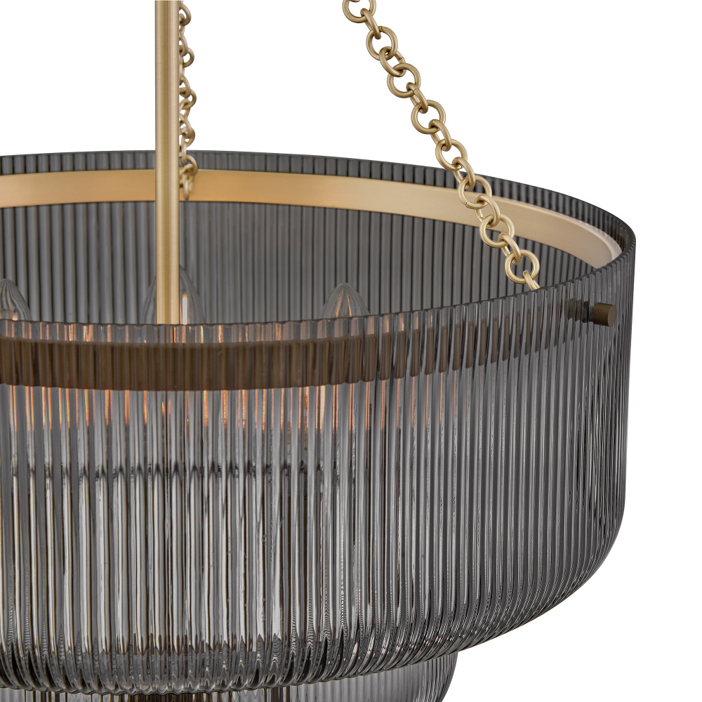 A clean design with traditional styling, Adella’s fine-ribbed glass shade creates a soft silhouette accented by fine details, delicate chains, and a sleek flared canopy. A Lacquered Brass finish complements Etched Opal or Smoke glass, accenting your living space with a distinguished aesthetic