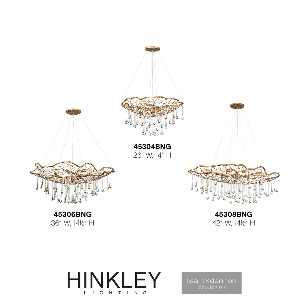 Imagine a net gently breaking the surface, then slowly emerging with a cascade of water droplets trickling through and shimmering with light. Laguna uses a handmade open framework design as the foundation in this artistic interpretation. Clear glass droplets fall at varying lengths, casting the light. Minimal hanging wires ensure the net itself appears to float, as a candle cluster emits light from within.