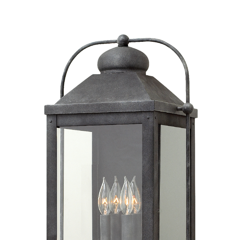 Anchorage is an early American lantern design crafted of solid aluminum to reflect a bold yet refined silhouette. The Aged Zinc or Light Oiled Bronze finish and clear glass complement the long clean lines, elegant arched carriage handle and sturdy knobs, resulting in a vintage style with classic charisma.