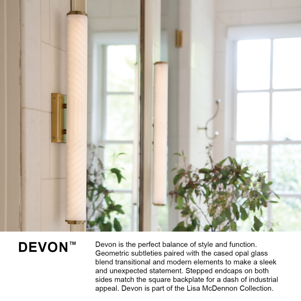 Devon is the perfect balance of style and function. Geometric subtleties paired with the cased opal glass blend transitional and modern elements to make a sleek and unexpected statement. Stepped endcaps on both sides match the square backplate for a dash of industrial appeal. Devon is part of the Lisa McDennon Collection.