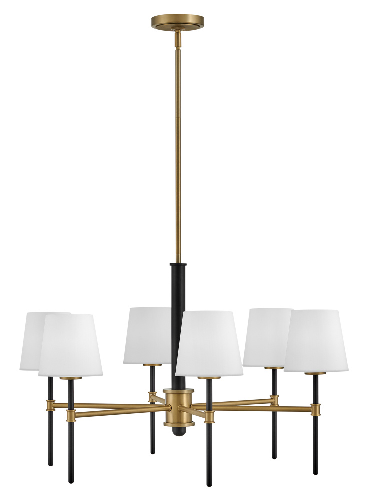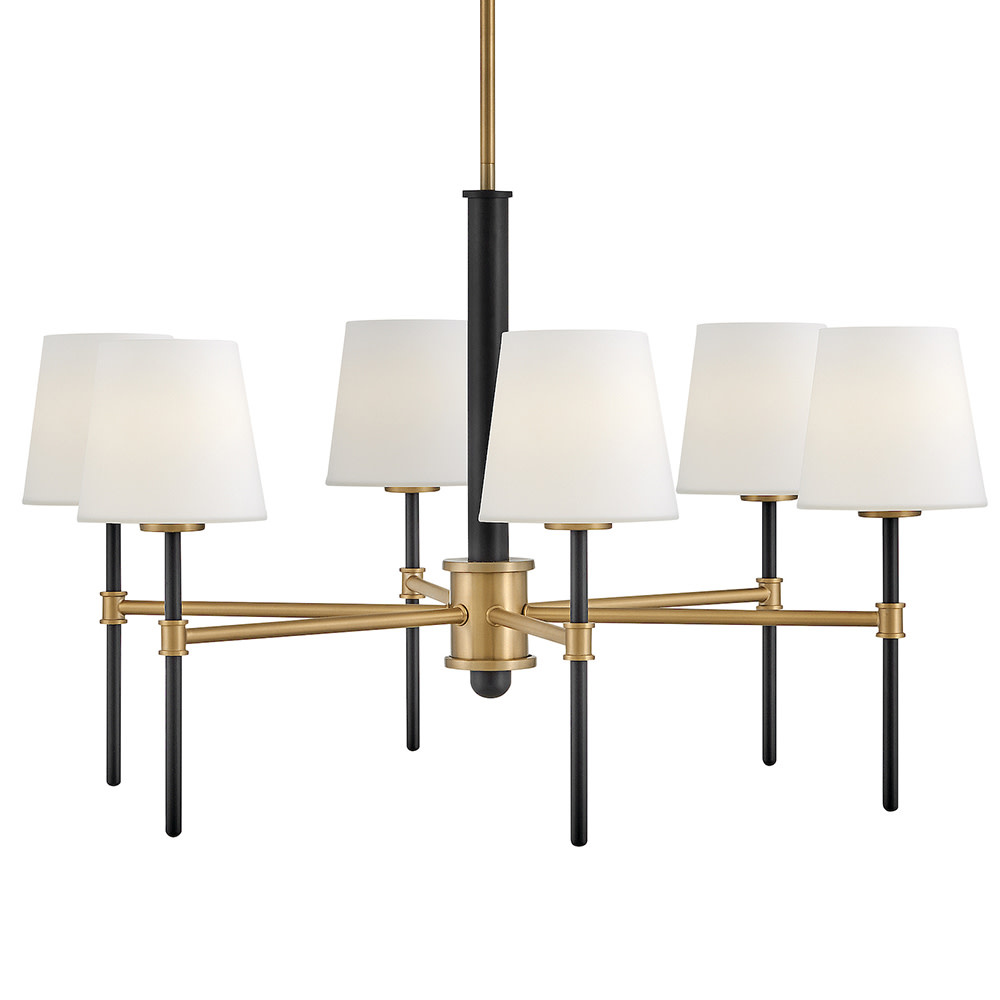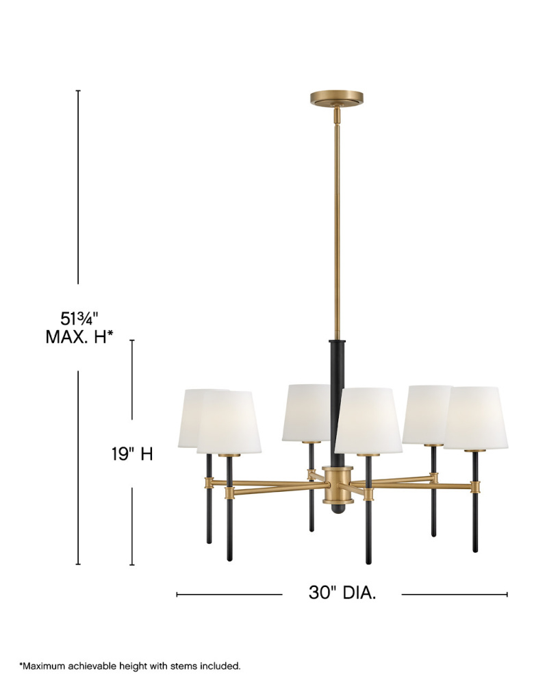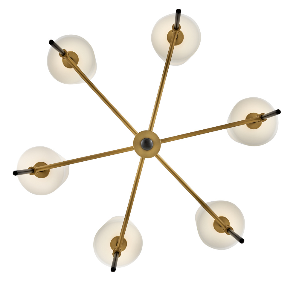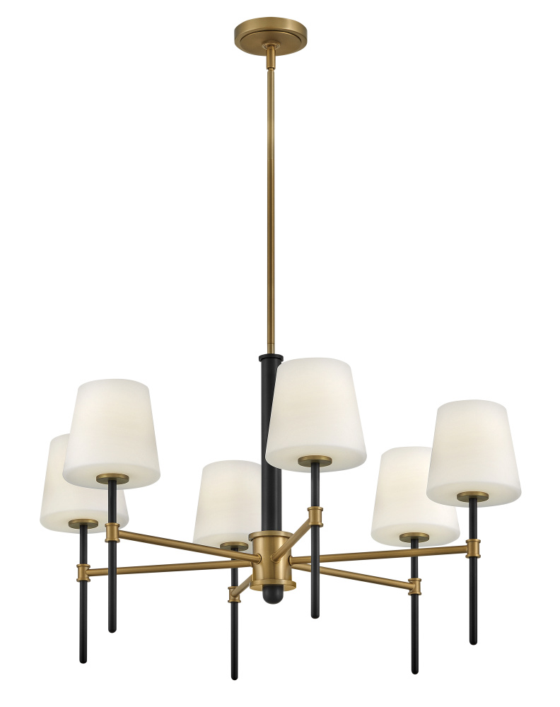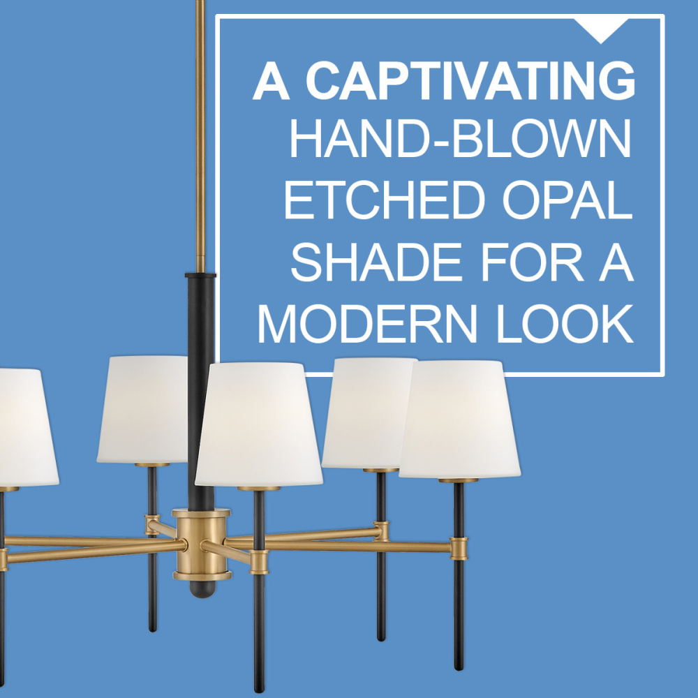 Saunders boasts a striking yet effortless appeal, blending traditional elements with captivating, mid-century modern details. A spoked silhouette and decorative stem holders are finished in Black and Lacquered Brass, paired with blown, etched opal glass shades.