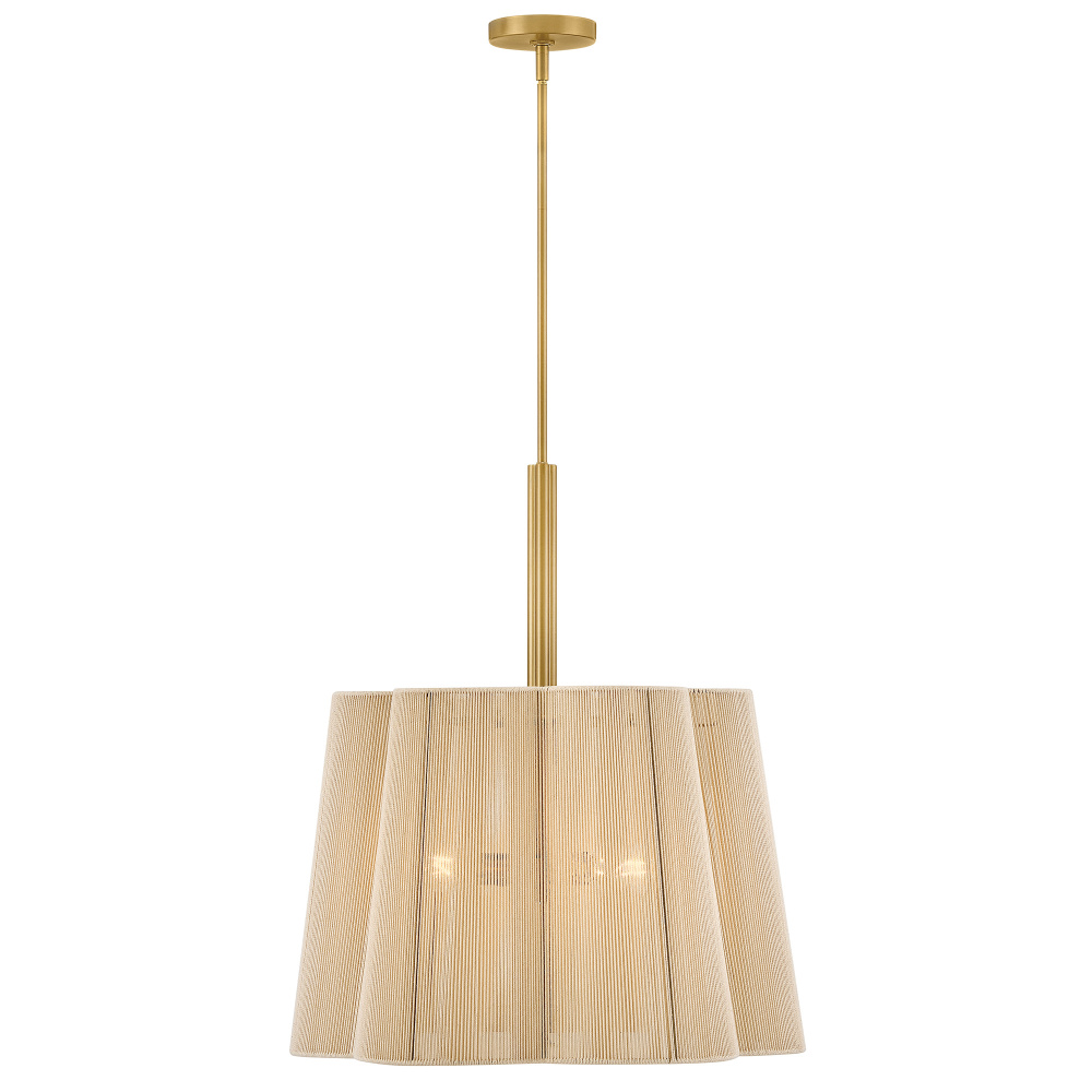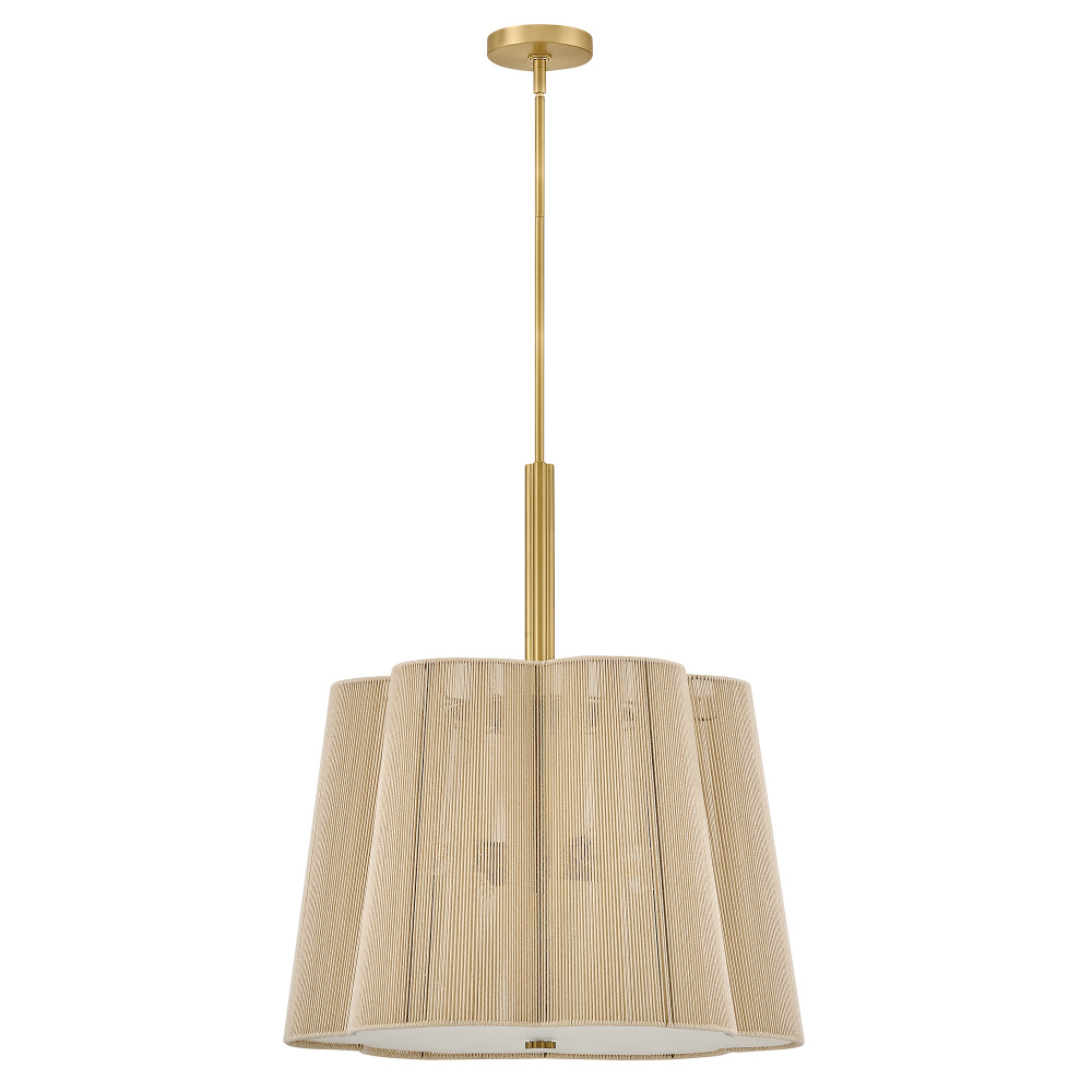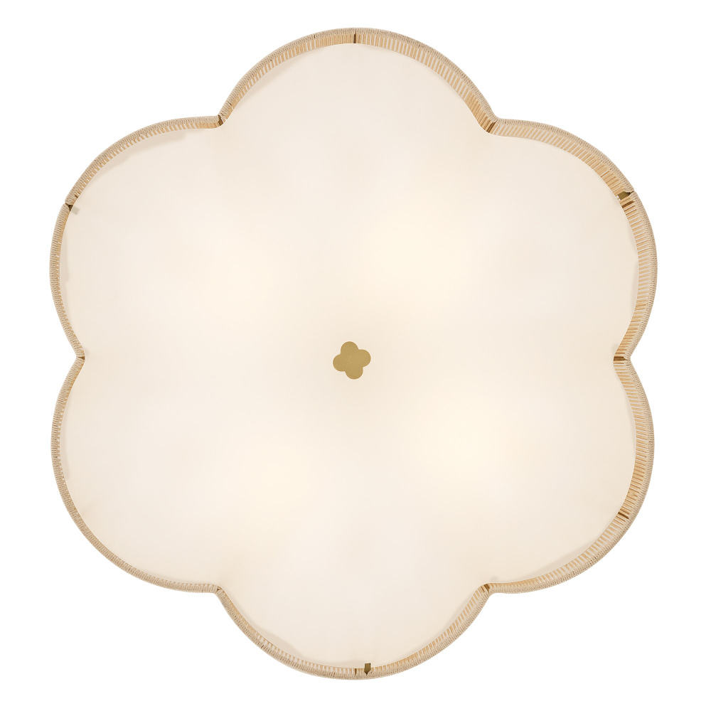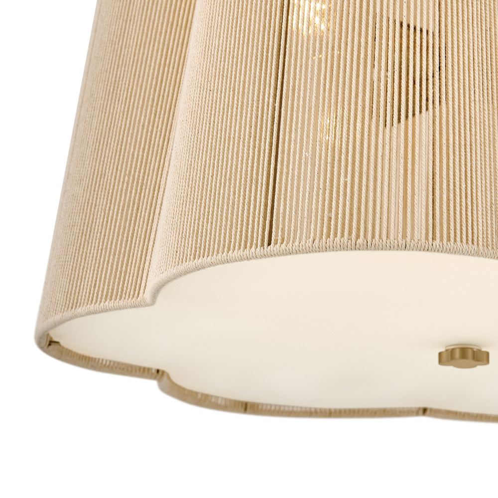 A chic yet casual decor statement infused with natural texture, Sasha’s subtly tapered, scalloped shade is hand-wrapped in natural-fiber cord, imparting an unexpected element of sheer softness to your decor. A clover-shaped Etched glass diffuser glows with welcoming illumination, secured by a complementing clover finial and a frame finished in Lacquered Brass.