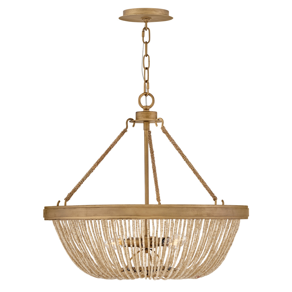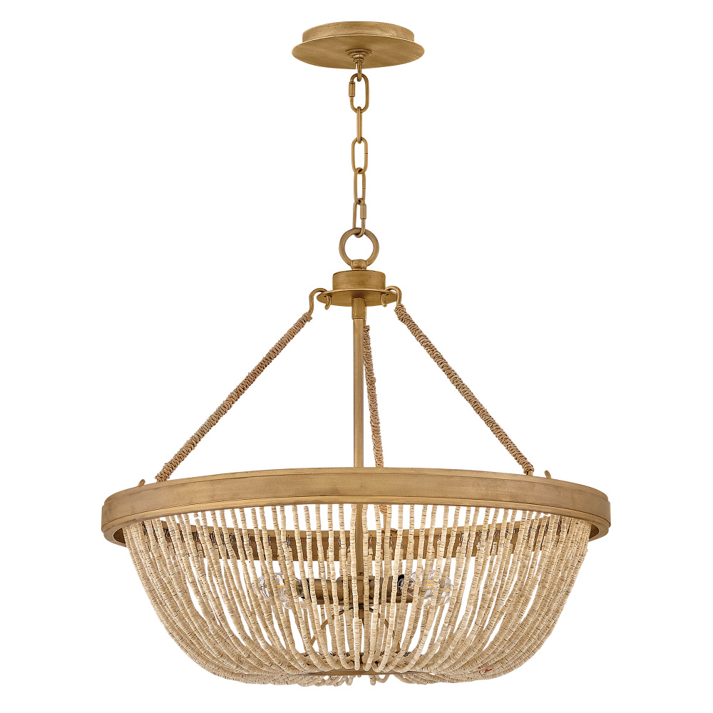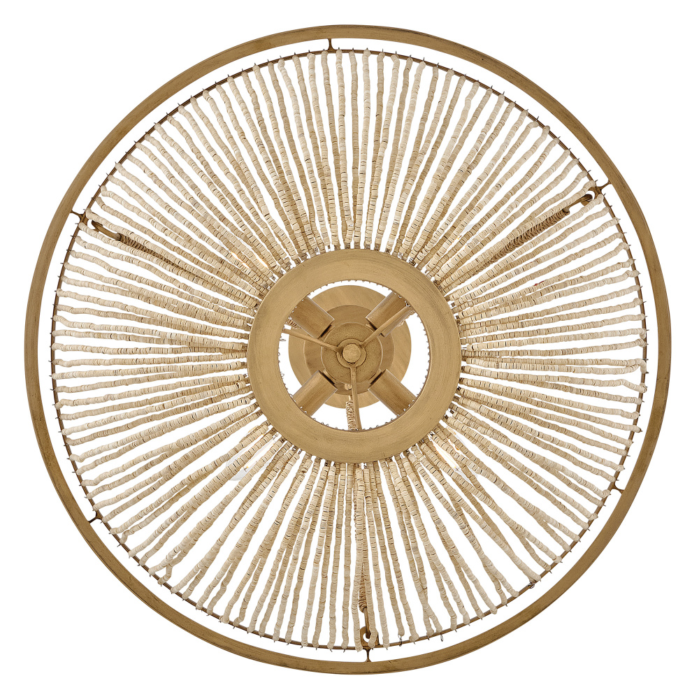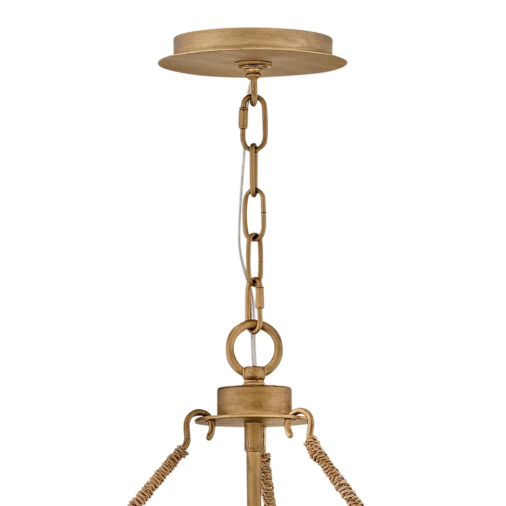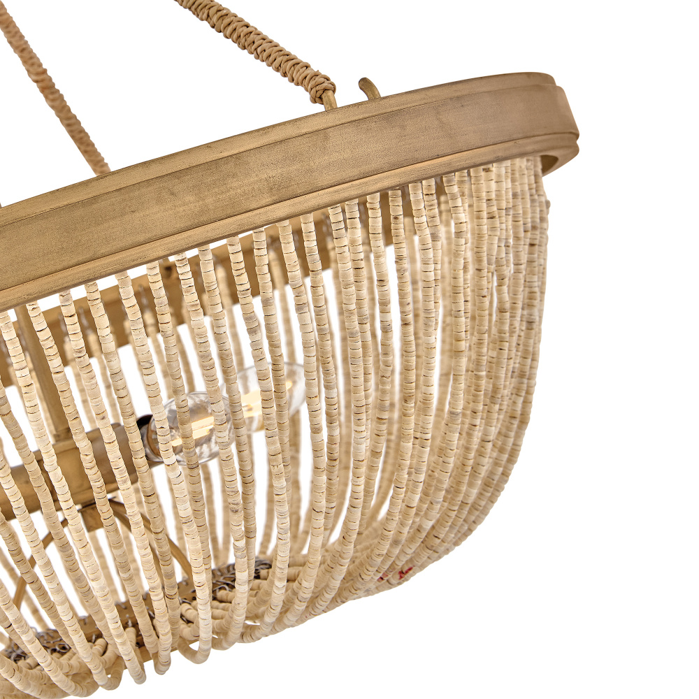 Introduce an element of natural texture and bohemian style to your living space. Tula’s artisan-crafted basket shade is hand-strung with draped strands of coco beads, creating a sheer curtain through which the warm light shines across your room. A hand-painted transitional frame suspended from decorative arms wrapped in natural fiber rope features a Burnished Gold finish with brushed distressed detailing that adds visual depth to the design.