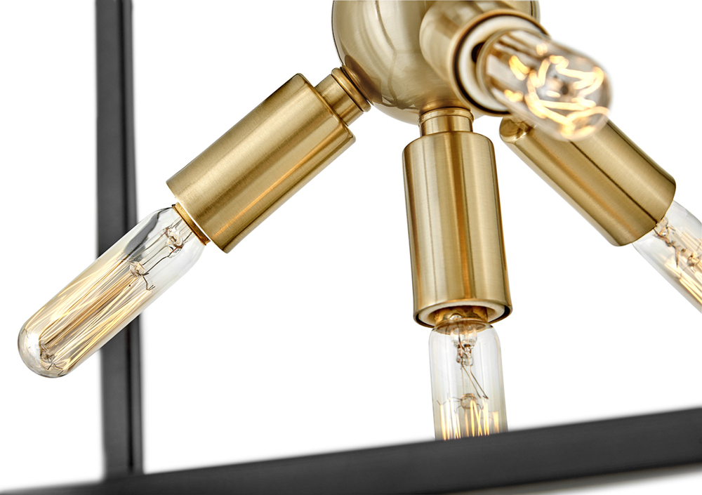 The striking Aros pendant showcases a provocative mid-century modern starburst cluster in a luxurious Warm Brass or Polished Nickel framed by an articulating, angular cage in prominent Black. For added drama, the sophisticated pendants dazzle with dimension to fill unique spaces or higher ceilings. Aros is part of the Lisa McDennon Collection.
