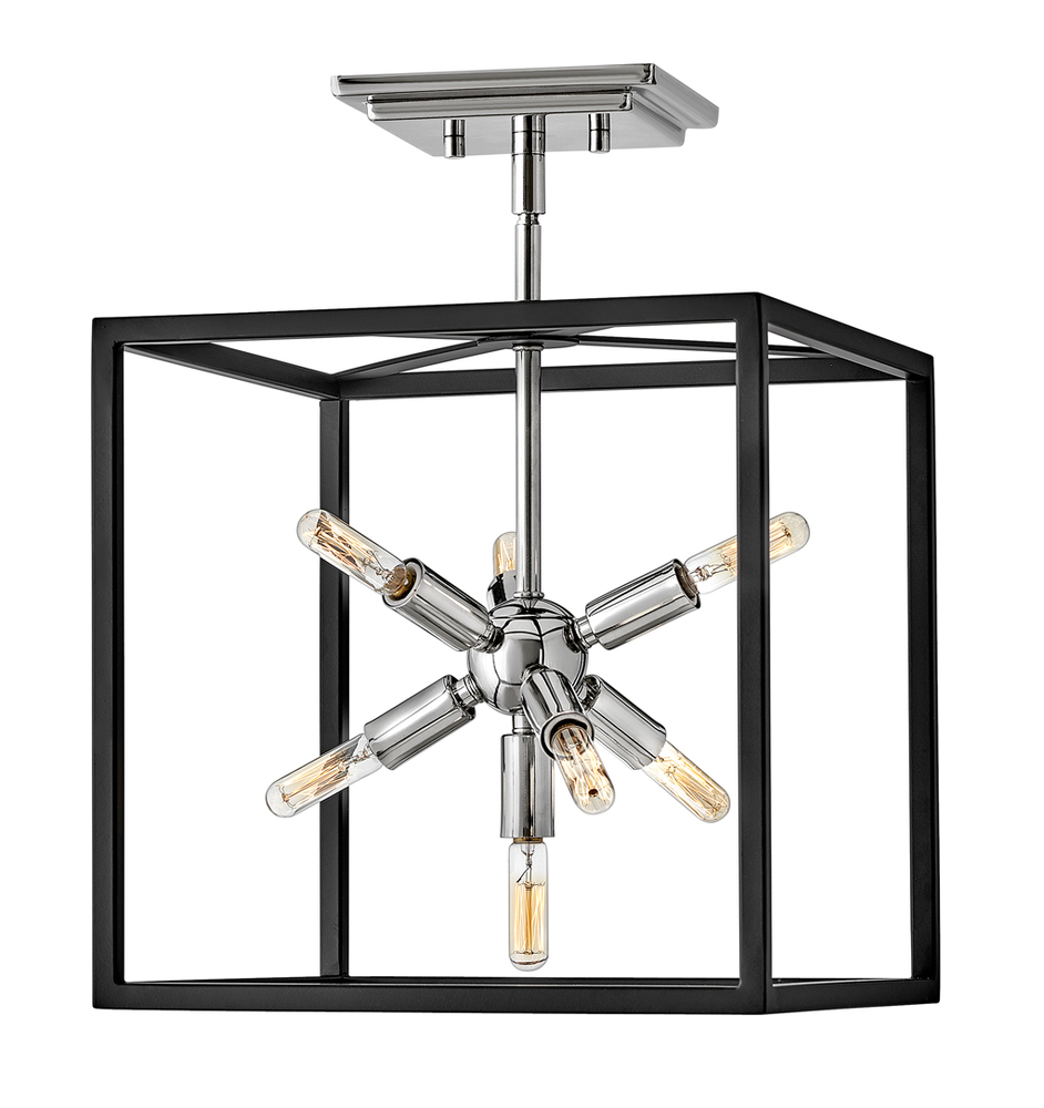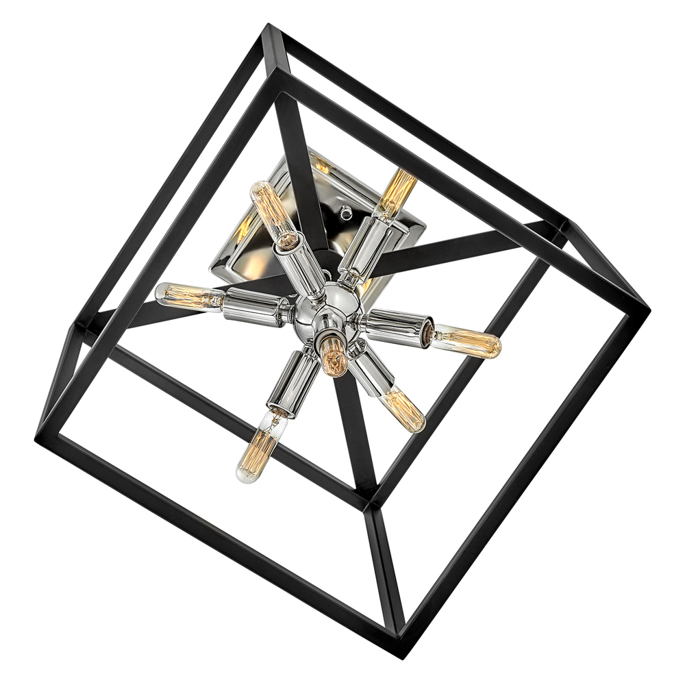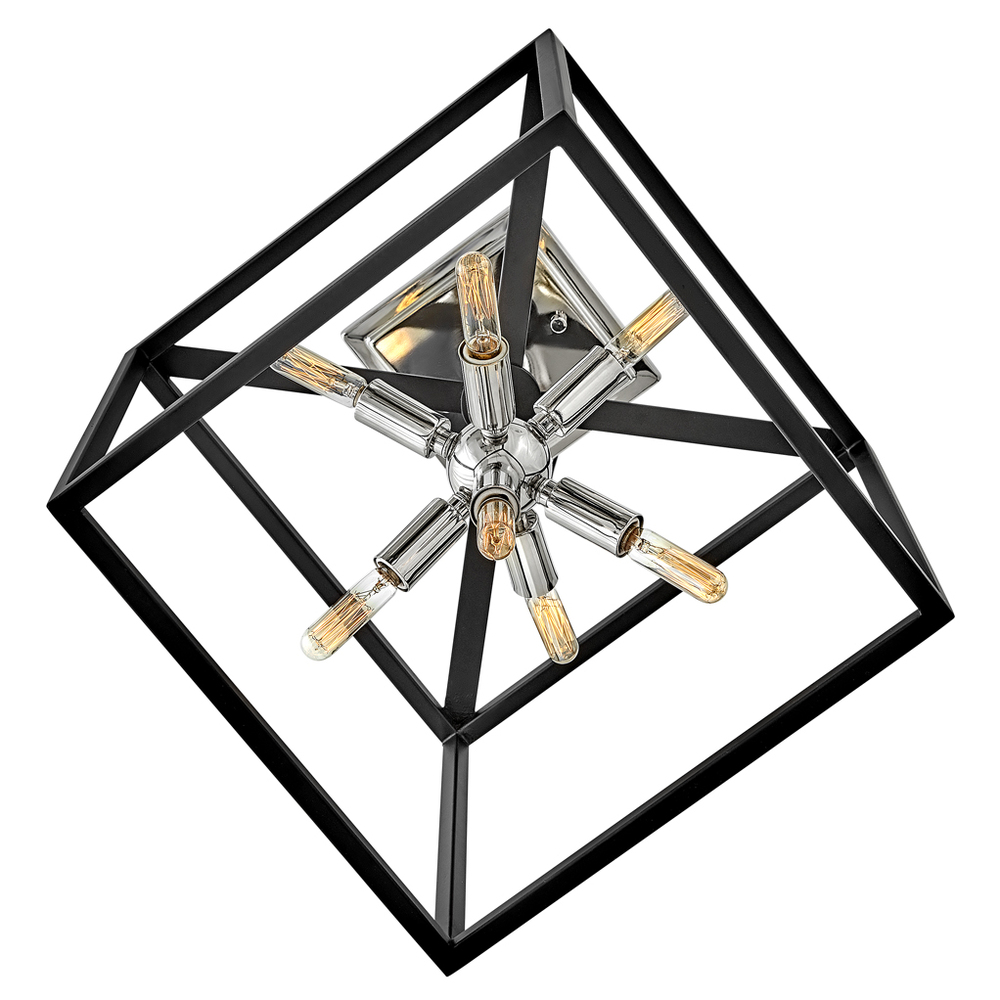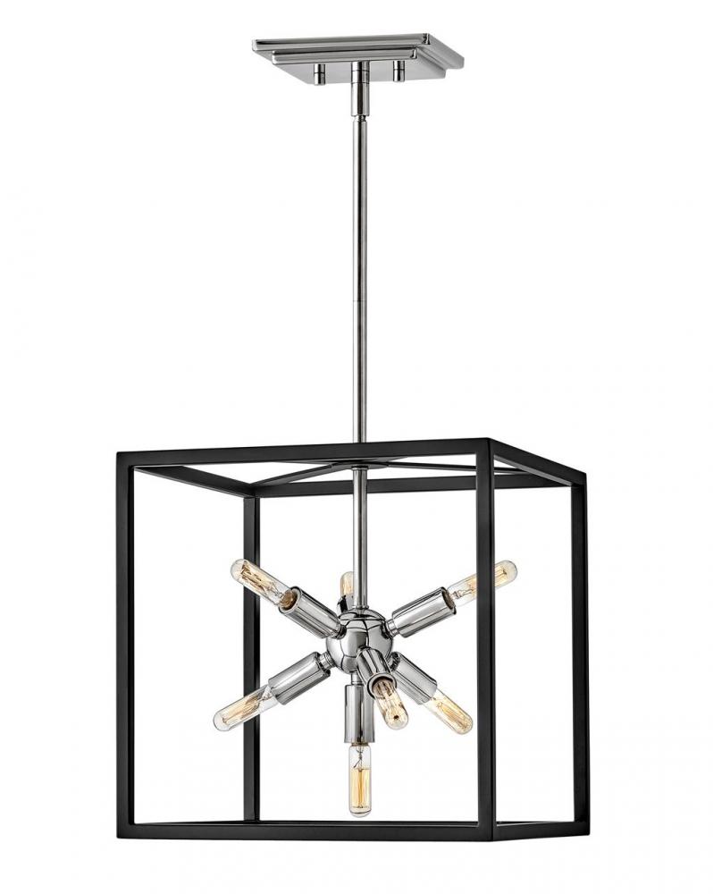 The striking Aros pendant showcases a provocative mid-century modern starburst cluster in a luxurious Warm Brass or Polished Nickel framed by an articulating, angular cage in prominent Black. For added drama, the sophisticated pendants dazzle with dimension to fill unique spaces or higher ceilings. Aros is part of the Lisa McDennon Collection.