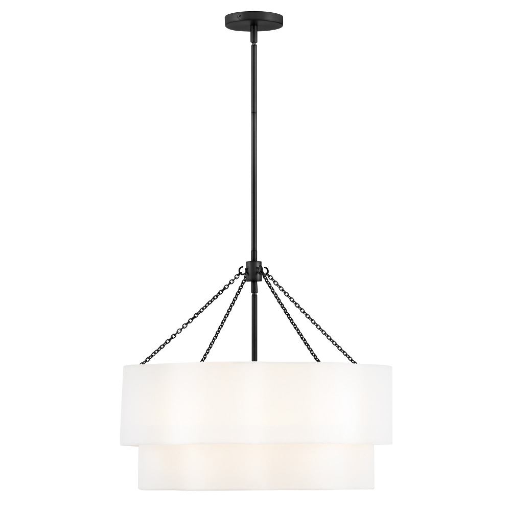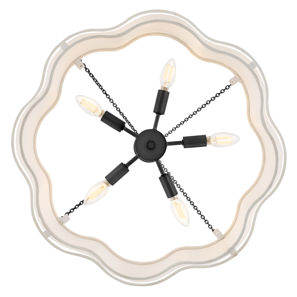 Splendidly soft, Gwen’s shapely scalloped shade complements inviting light with layers of Off-White Linen suspended from delicate chains and minimal metal stems. A Black or Lacquered Brass finish provides a versatile complement to any interior style.