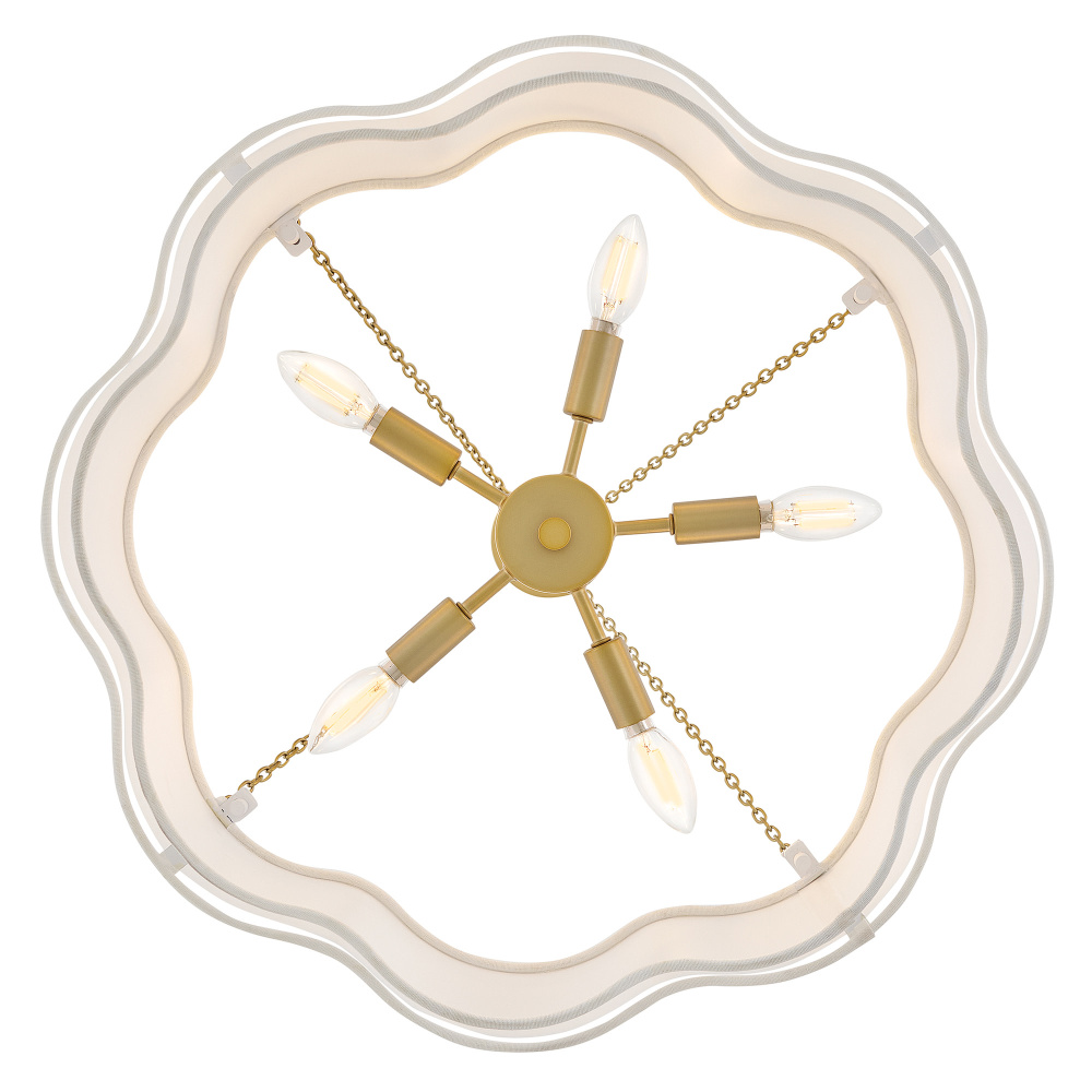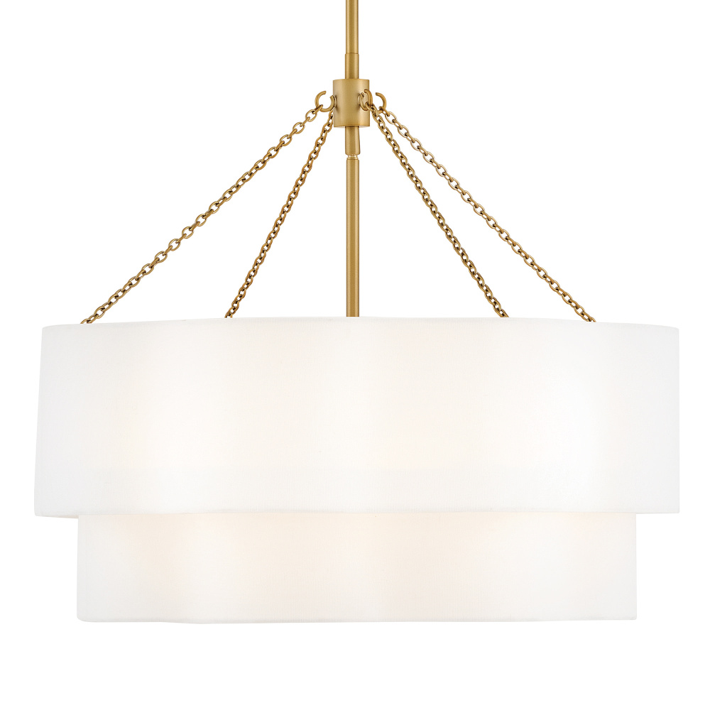 Splendidly soft, Gwen’s shapely scalloped shade complements inviting light with layers of Off-White Linen suspended from delicate chains and minimal metal stems. A Black or Lacquered Brass finish provides a versatile complement to any interior style.
