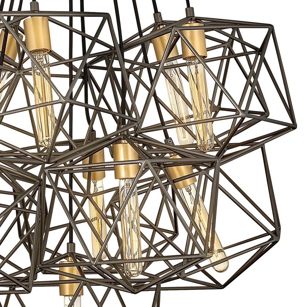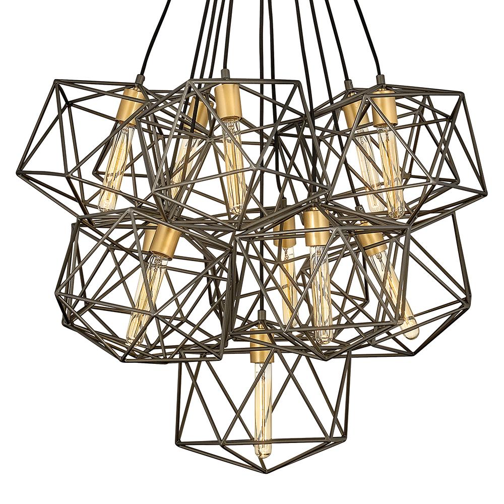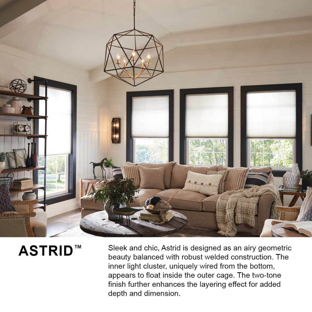 Sleek and chic, Astrid is designed as an airy geometric beauty balanced with robust welded construction. The inner light cluster, uniquely wired from the bottom, appears to float inside the outer cage. The two-tone finish further enhances the layering effect for added depth and dimension.