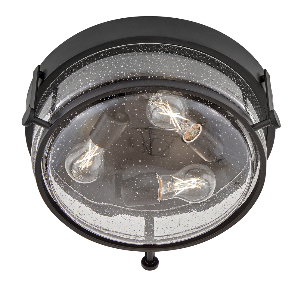 Harper’s sleek, retro design elevates the traditional ceiling mount with a unique clear seedy glass bound by a prominent metal ring and decorative knobs. Available in five classic finishes.
