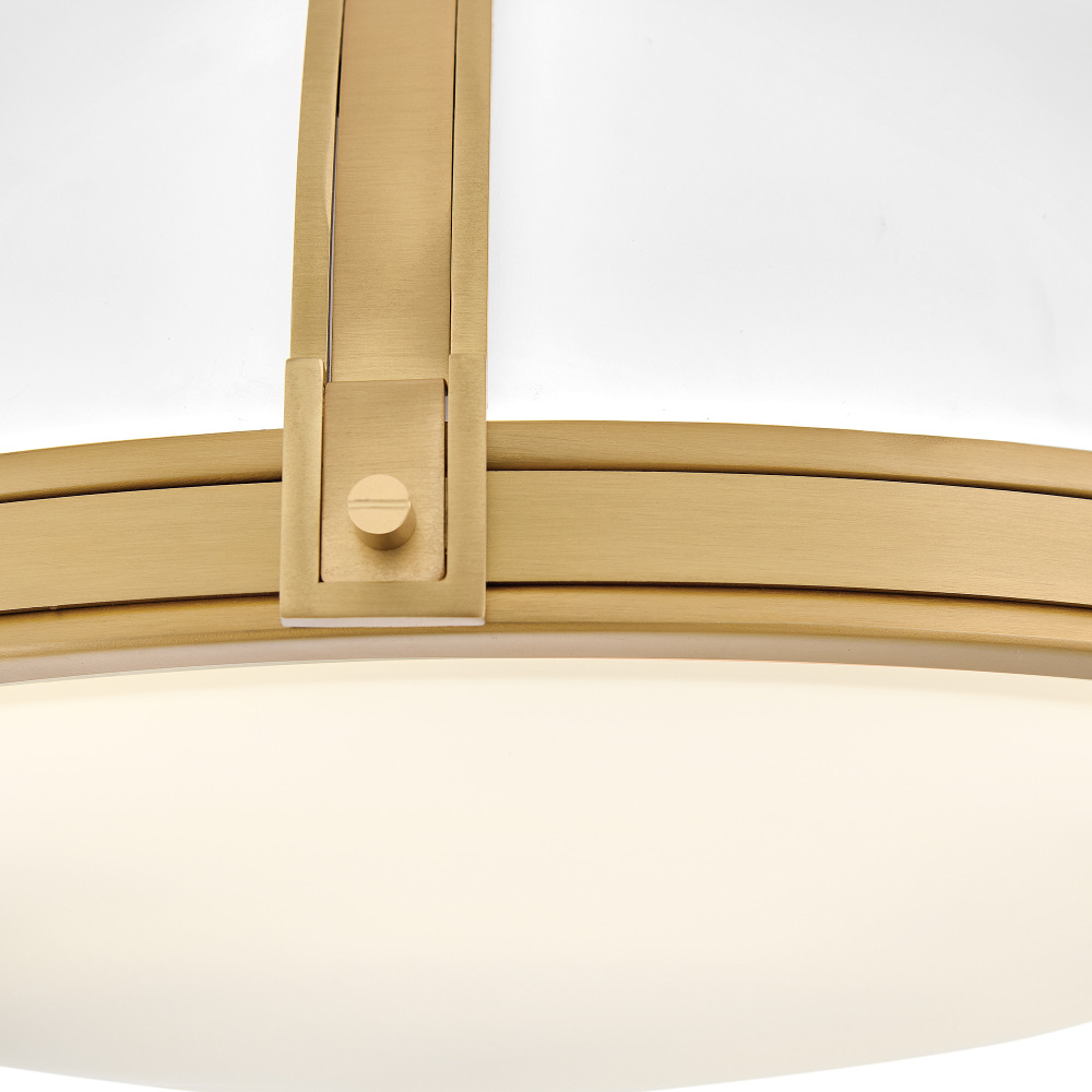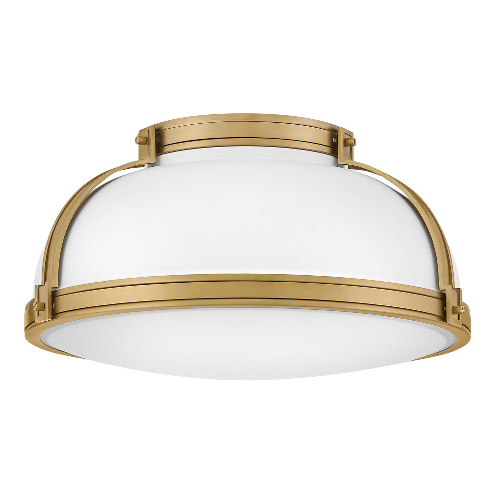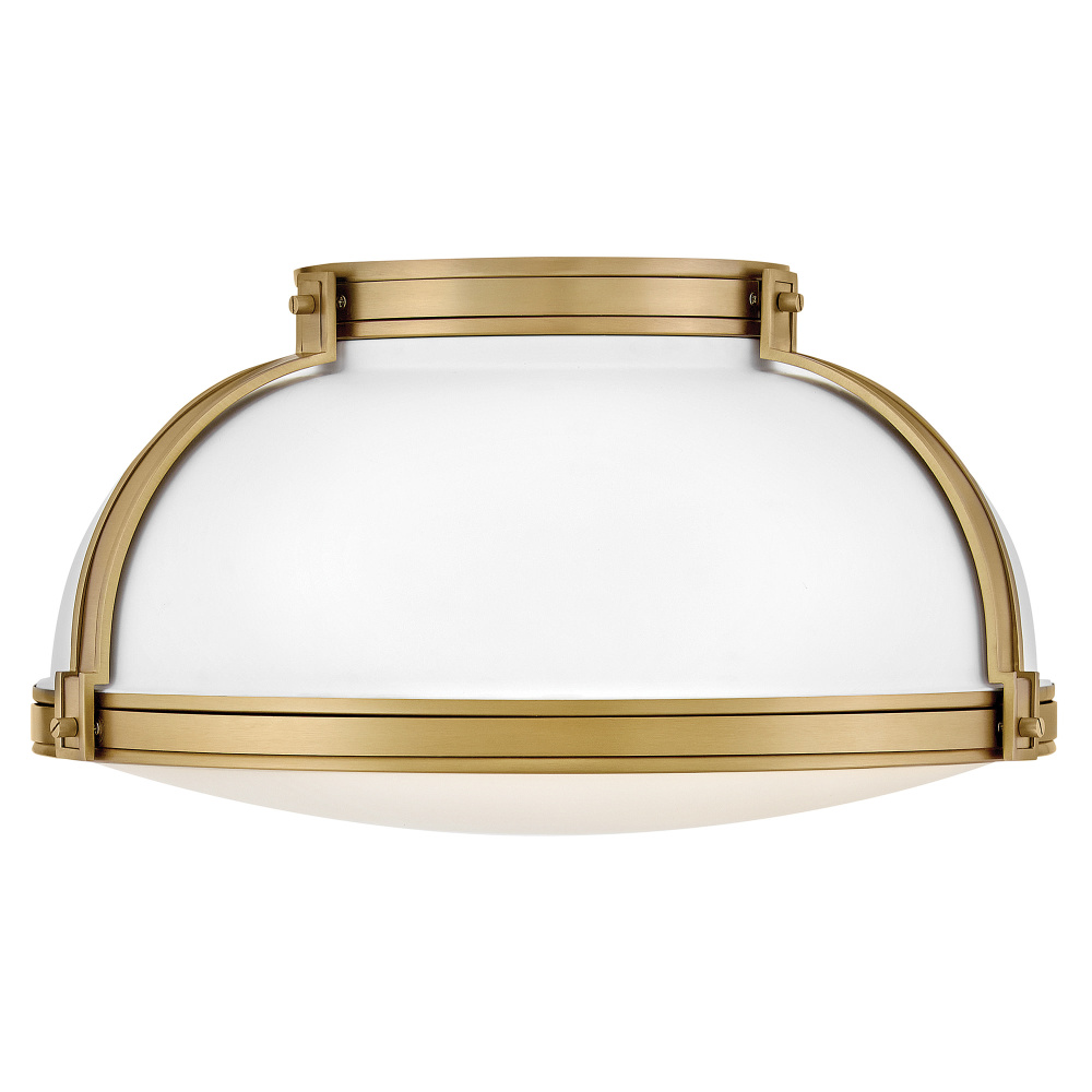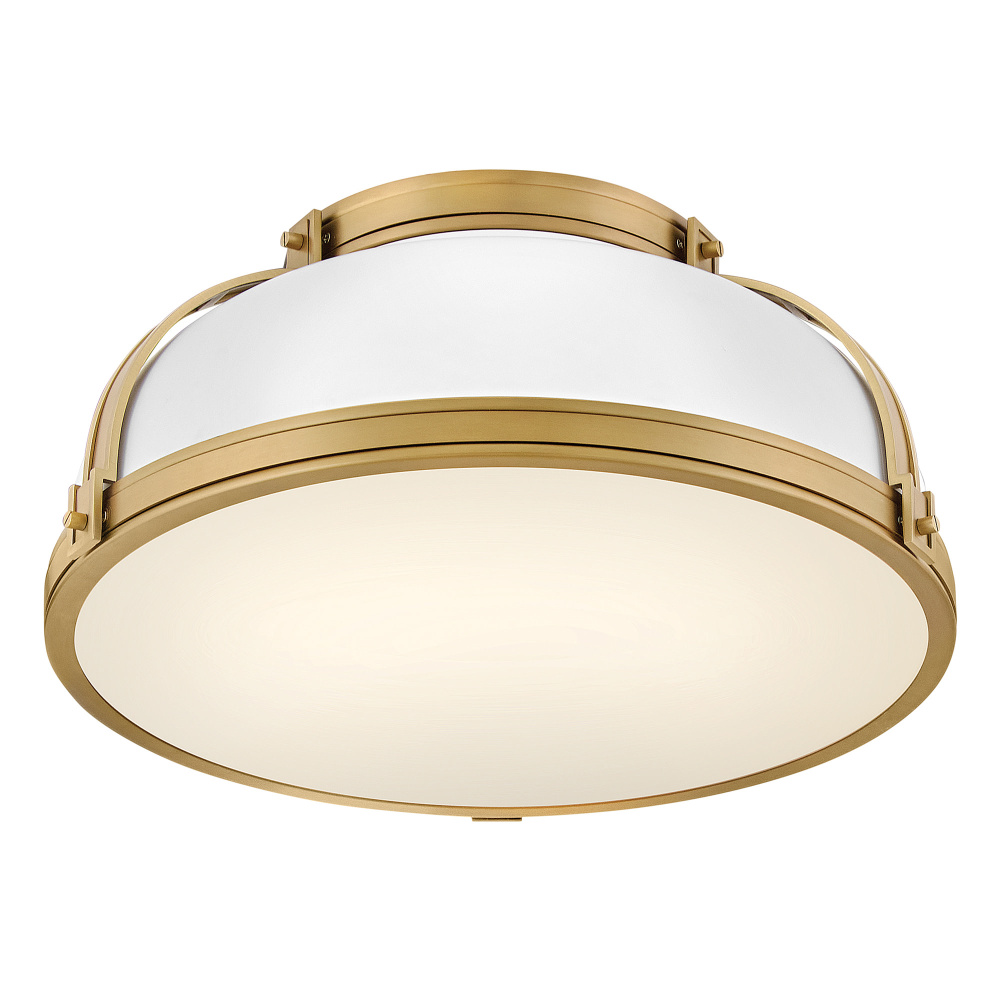 Timeless with a classic equestrian aesthetic, Barton’s metal dome shade with double-strap design is available in Black, Matte White, or Gloss White with Vivid Navy finishes complemented by Lacquered Brass and an Etched Opal glass diffuser.