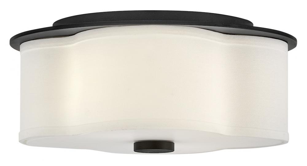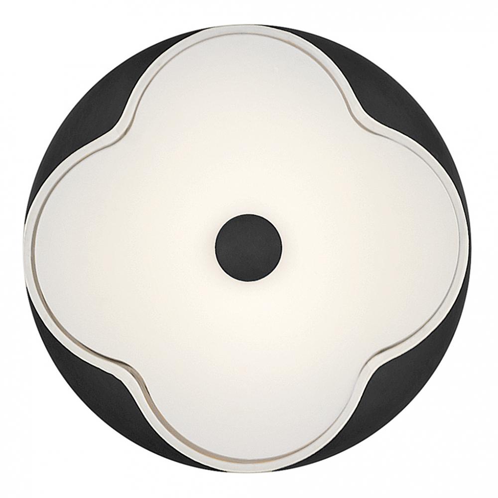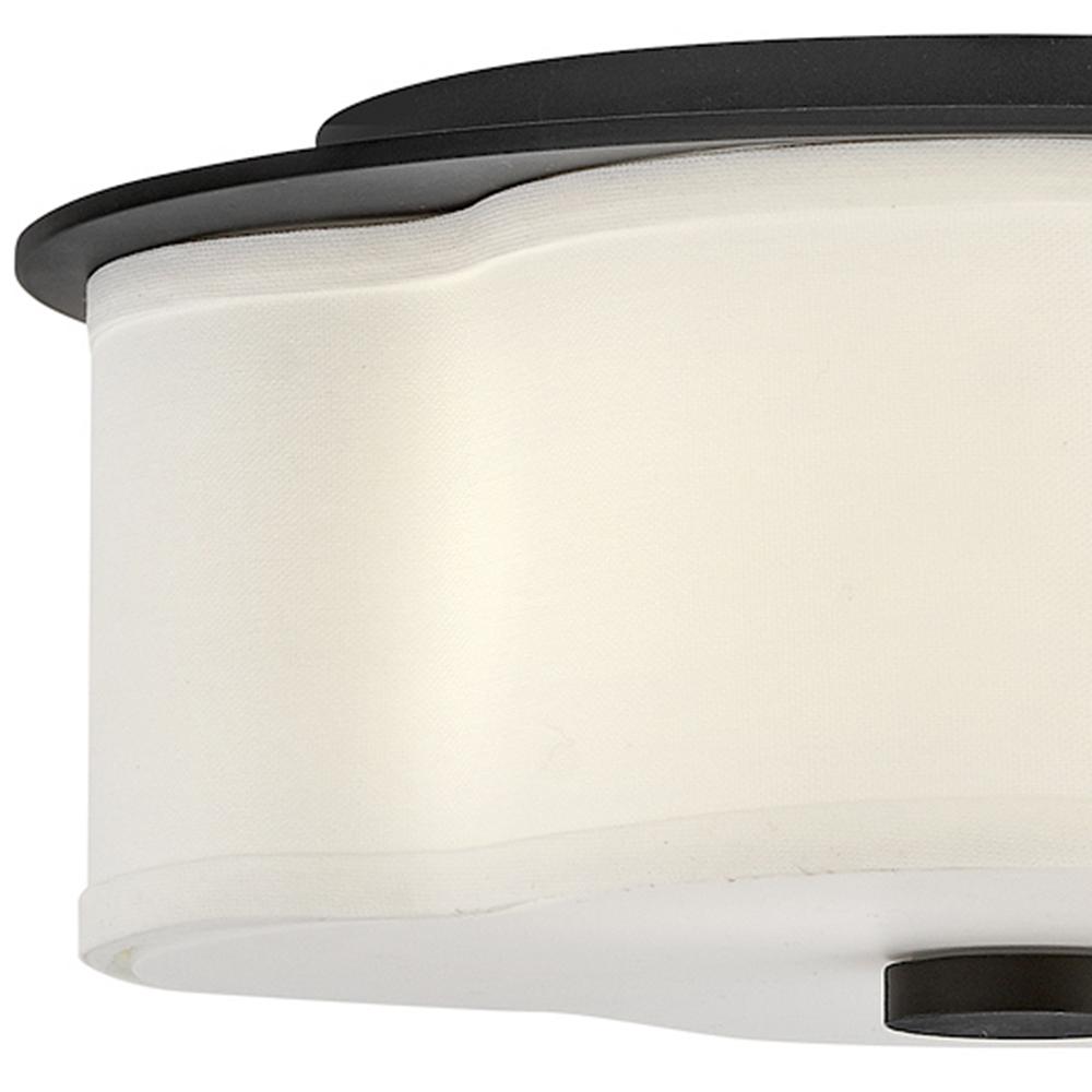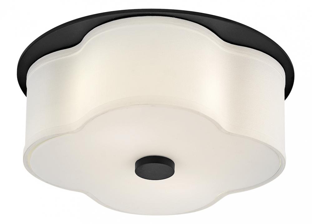 The curved quatrefoil silhouette of Delaney’s off-white linen shade elegantly complements traditional aesthetics. Etched glass softly diffuses light, while an oversized decorative canopy in Heritage Brass or Black provides a subtle contrast.