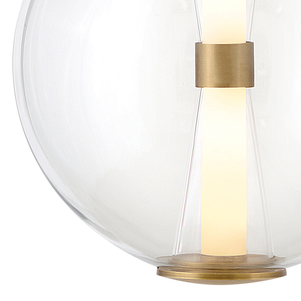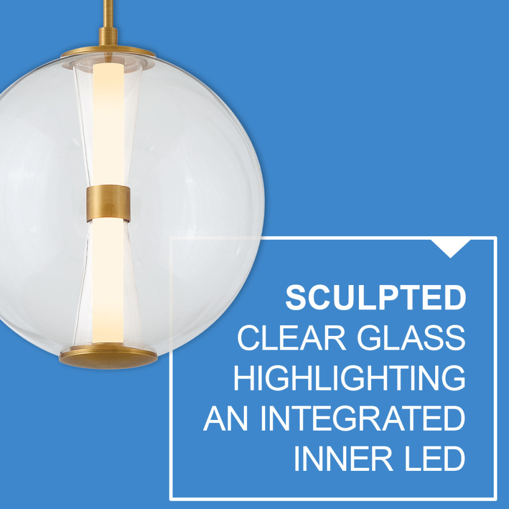 The centerpiece of Elin's bold and contemporary design is its sculpted clear glass that highlights an integrated LED inner light source. Featuring both conventional and striking elements, Elin is ideal for modern and transitional interiors and available in Black or Lacquered Brass finish options.