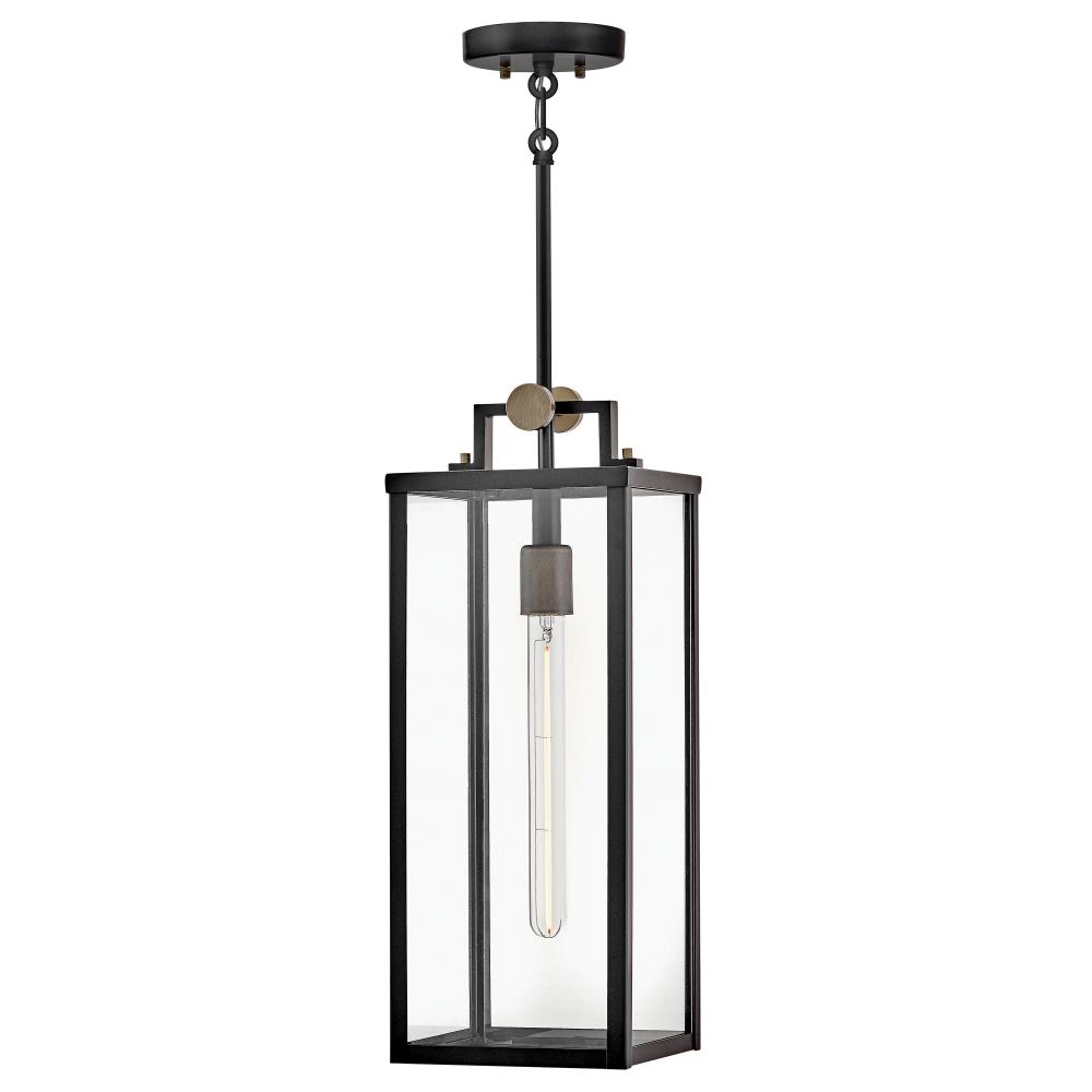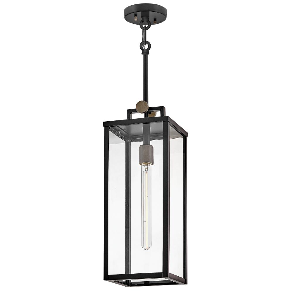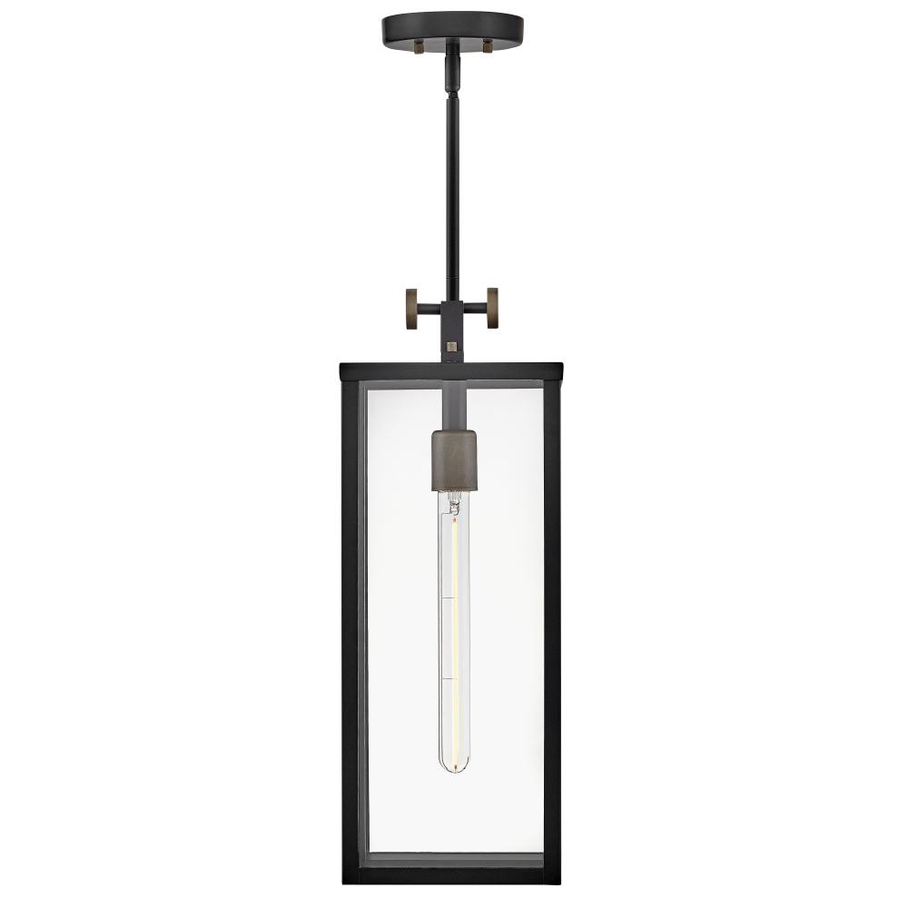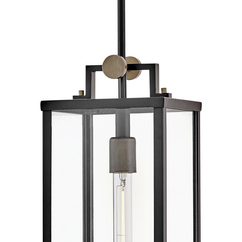 Striking and airy, Catalina breathes modern simplicity into outdoor spaces. Oversized clear glass, a unique single socket, and a two-tone Black with Burnished Bronze finish pair perfectly to present a statement-making fixture. The finishing touch is a floating effect created by the classic rectangular lantern design suspended from a top knob.