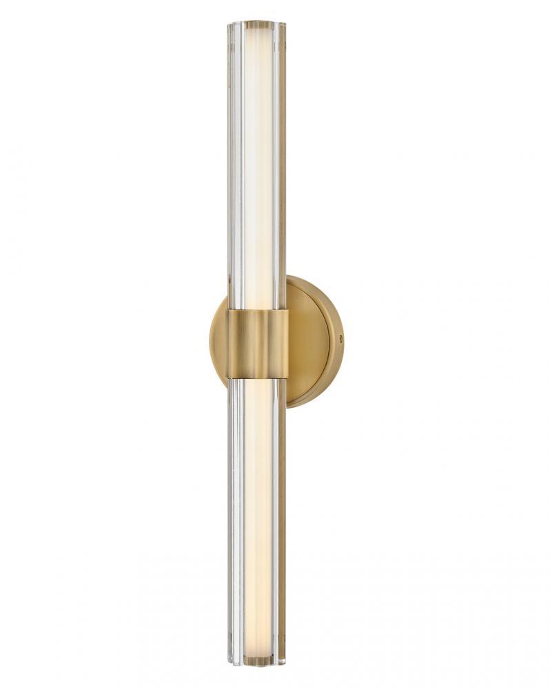 Georgette’s sophisticated silhouette is enhanced by clear fluted crystal, creating a stunning fixture with bold symmetry and captivating details. A chic central cuff and back plate provide balance and contrast that effortlessly complements any space with a Black Oxide or Lacquered Brass finish.