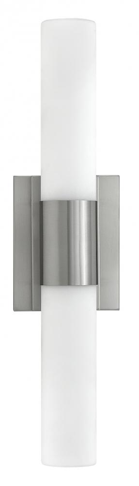 Portia's slim profile unifies design and technology. A pair of blown etched opal glass cylinders extends from a center metal fixture body, creating a streamlined cylindrical form. Finished in either Brushed Nickel or Polished Nickel, this eco-efficient linear LED collection is fully dimmable and provides even, warm white light. The raceway back plate and optional junction box cover plate provide multiple mounting opportunities.