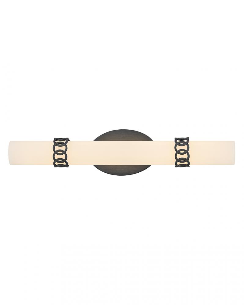 Reminiscent of the fanciful detailing found in fine jeweled bracelets, Eliza’s decorative chain cuffs accentuate its tasteful etched opal glass. Fully dimmable integrated LEDs evenly cast bright yet comfortable illumination to fill your entire bathroom or living space.
