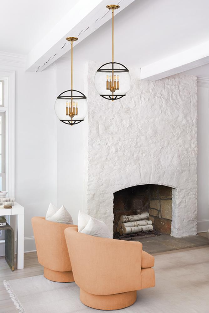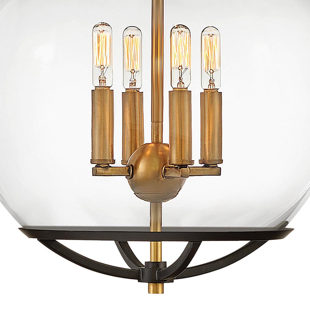 The wide glass band featured in Calvin clearly has global appeal, but the sphere of influence does not stop there. The orb is completed by the rounded, open cage on top and bottom to add style and stability. This mid-century modern silhouette in Heritage Brass or Black with Heritage Brass finish encloses a classic candle cluster.