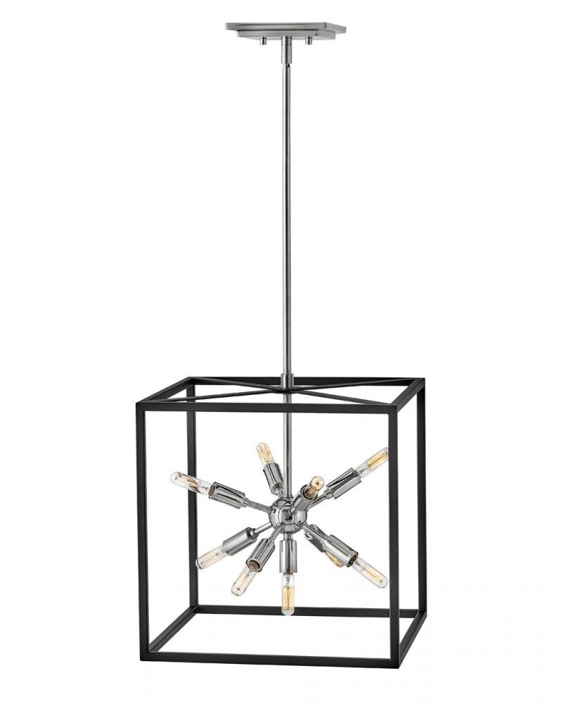The striking Aros pendant showcases a provocative mid-century modern starburst cluster in a luxurious Warm Brass or Polished Nickel framed by an articulating, angular cage in prominent Black. For added drama, the sophisticated pendants dazzle with dimension to fill unique spaces or higher ceilings. Aros is part of the Lisa McDennon Collection.