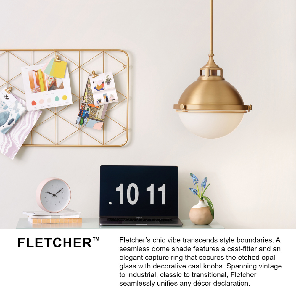 Fletcher's chic vibe transcends style boundaries. A seamless dome shade features a cast-fitter and an elegant capture ring that secures the etched opal glass with decorative cast knobs. Spanning vintage to industrial, classic to transitional, Fletcher seamlessly unifies any décor declaration.