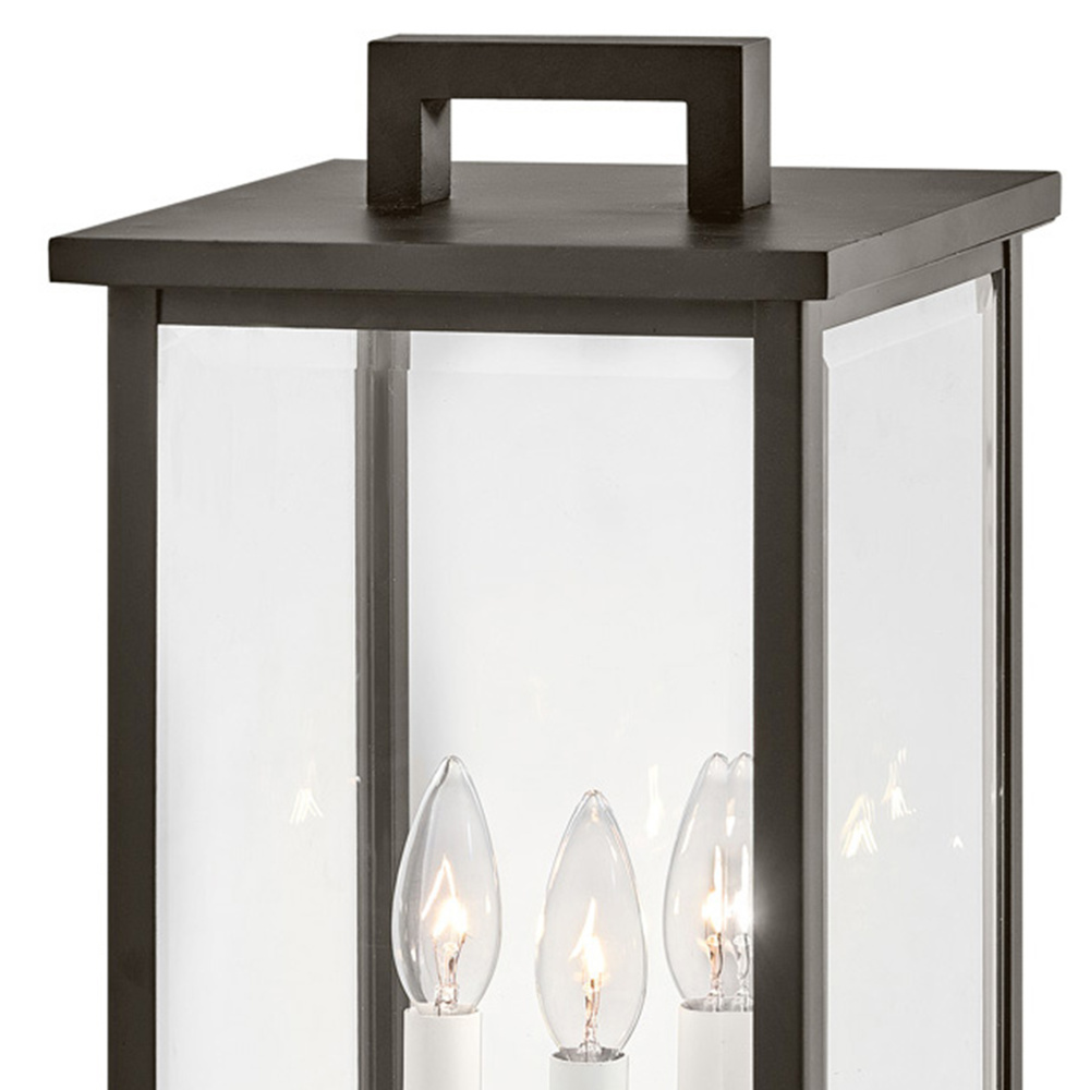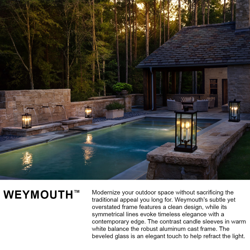 Modernize your outdoor space without sacrificing the traditional appeal you long for. Weymouth's subtle yet overstated frame features a clean design, while its symmetrical lines evoke timeless elegance with a contemporary edge. The contrast candle sleeves in warm white balance the robust aluminum cast frame. The beveled glass is an elegant touch to help refract the light.