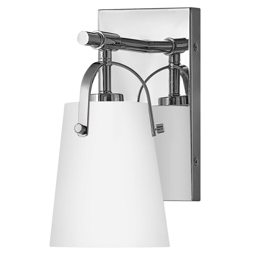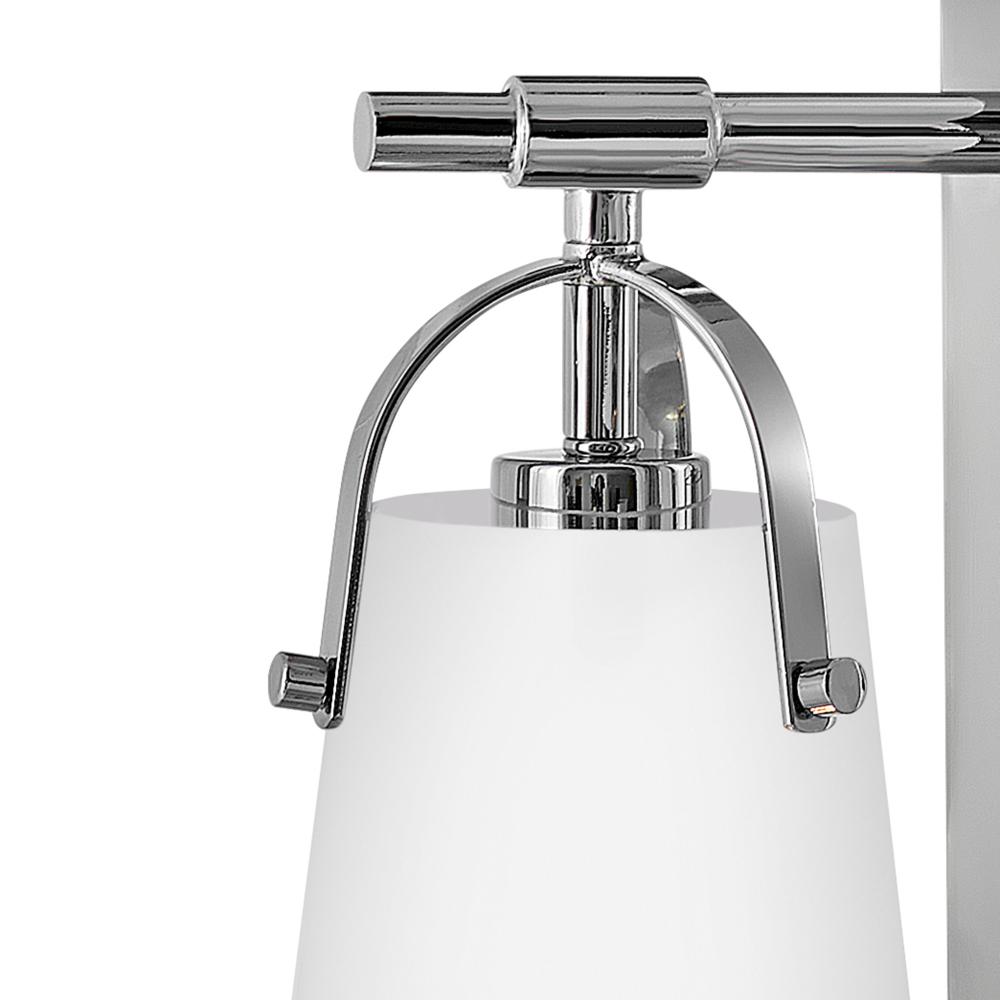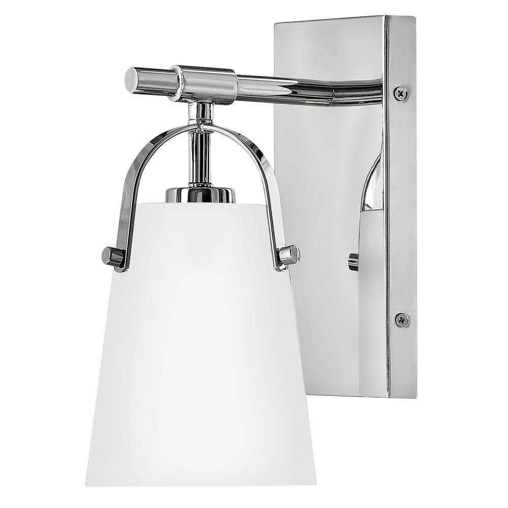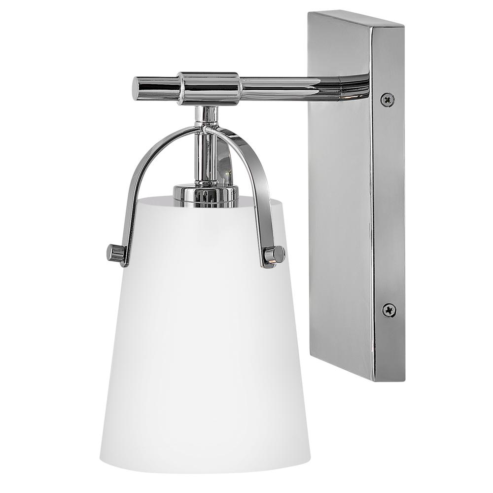 Clean and airy, Foster breathes composed simplicity into any bath space. Its softly tapered glass shade, suspended from arched handle prongs, creates a sophisticated transitional silhouette, enhanced by practical yet stylized details.