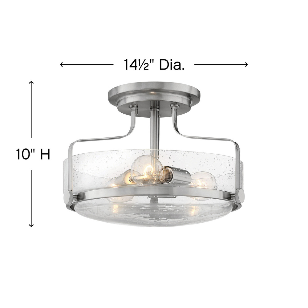 Harper’s sleek, retro design elevates the traditional ceiling mount with a unique clear seedy glass bound by a prominent metal ring and decorative knobs. Available in five classic finishes.