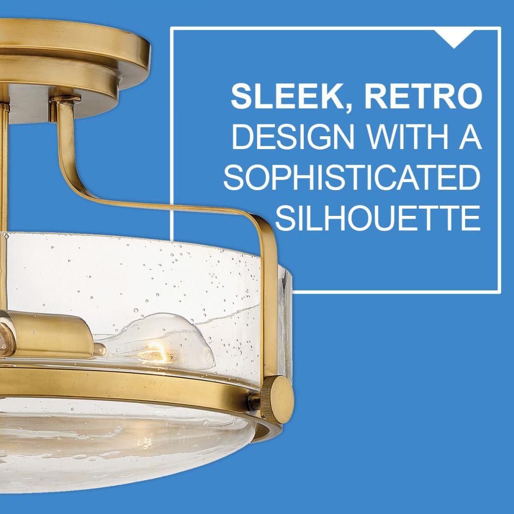 Harper’s sleek, retro design elevates the traditional ceiling mount with a unique clear seedy glass bound by a prominent metal ring and decorative knobs. Available in five classic finishes.
