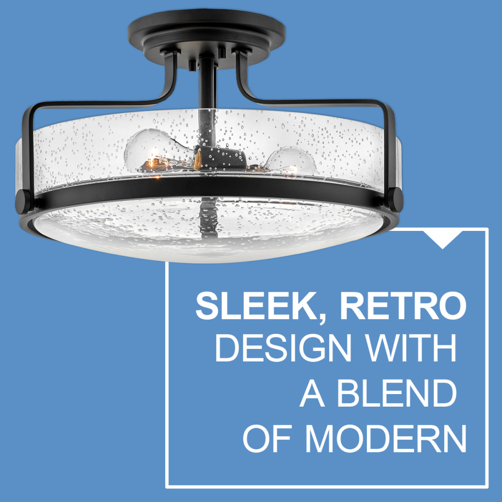Harper’s sleek, retro design elevates the traditional ceiling mount with a unique clear seedy glass bound by a prominent metal ring and decorative knobs. Available in five classic finishes.