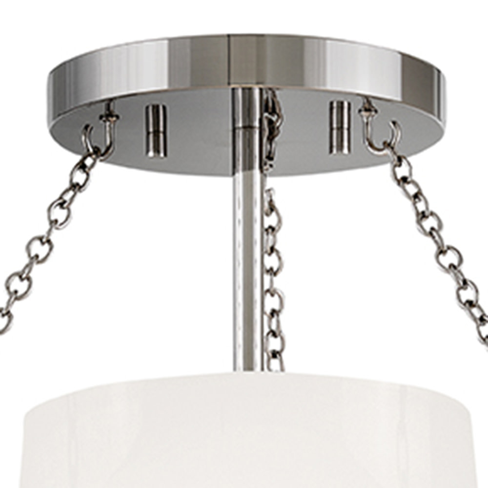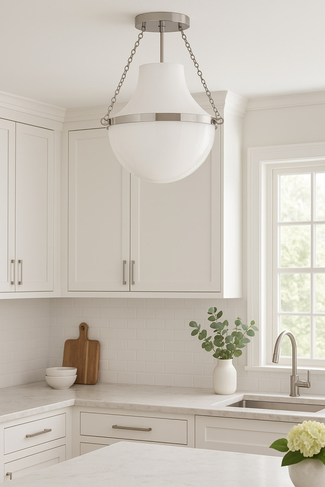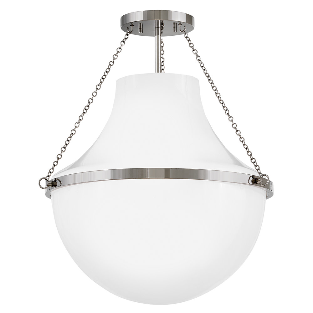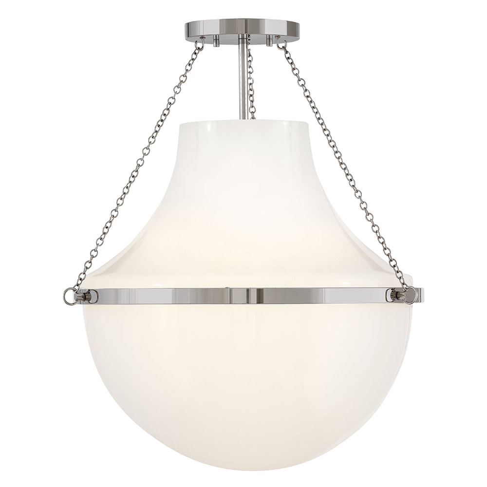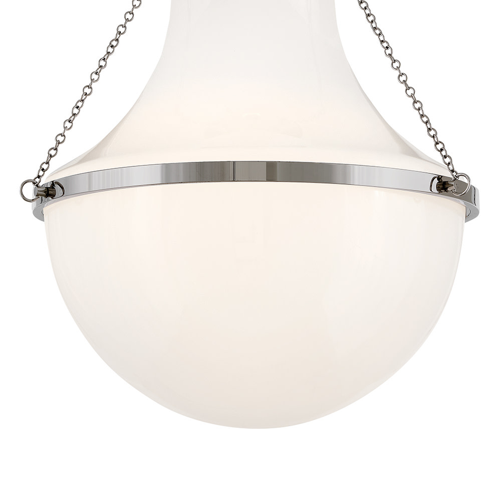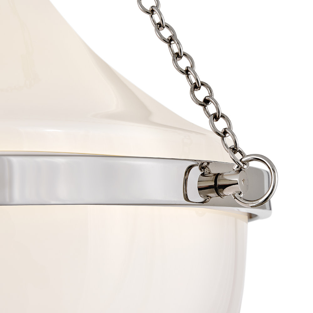 Fusing a sculpted, modern form with classically styled details, Collins features a transitional teardrop shade crafted from blown, cased opal glass. A central metal band and delicate chain uprights are available in Heritage Brass or Black Oxide finishes.