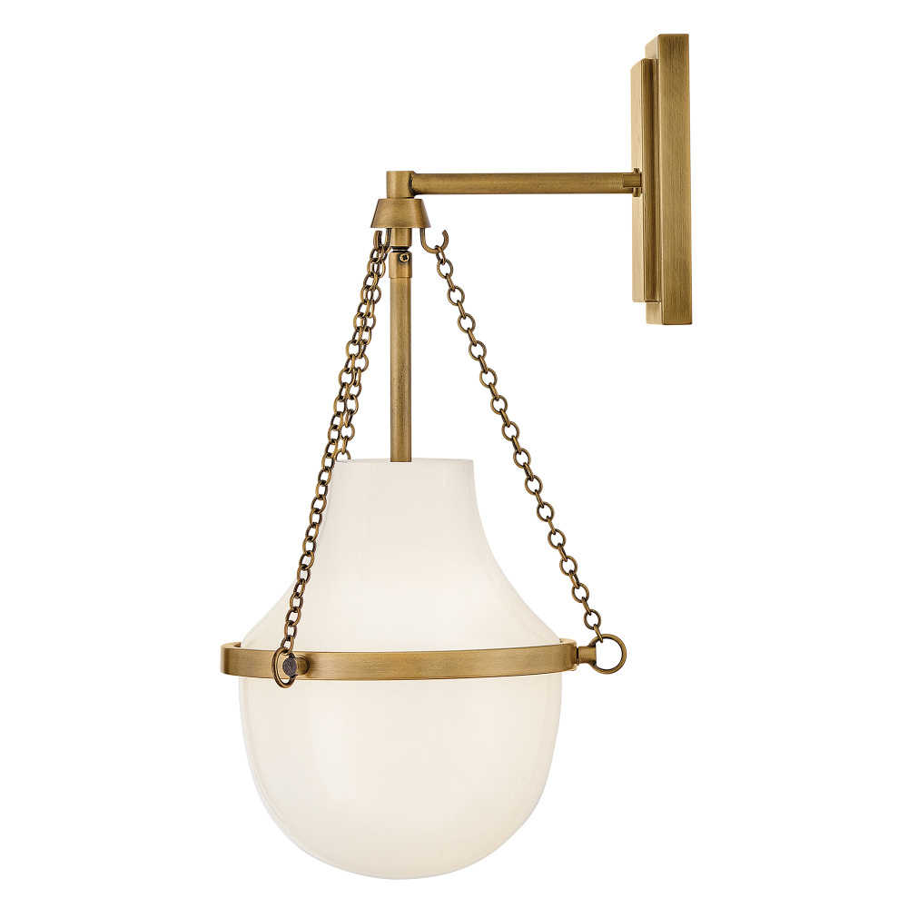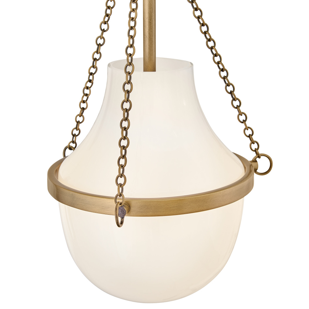 Fusing a sculpted, modern form with classically styled details, Collins features a transitional teardrop shade crafted from blown, Cased Opal glass. A central metal band and delicate chain uprights are available in Black Oxide, Heritage Brass, Heritage Bronze, or Polished Nickel finishes.