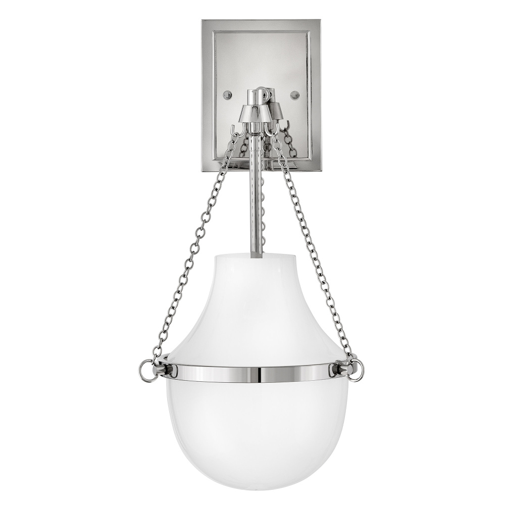 Fusing a sculpted, modern form with classically styled details, Collins features a transitional teardrop shade crafted from blown, Cased Opal glass. A central metal band and delicate chain uprights are available in Black Oxide, Heritage Brass, Heritage Bronze, or Polished Nickel finishes.