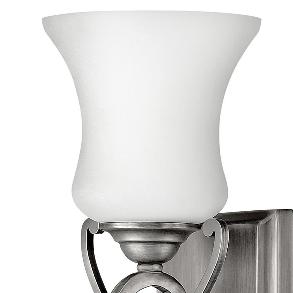 Brooke's updated traditional look features a minimalist forged scroll design in Antique Nickel and Olde Bronze that elegantly complements its etched opal glass.