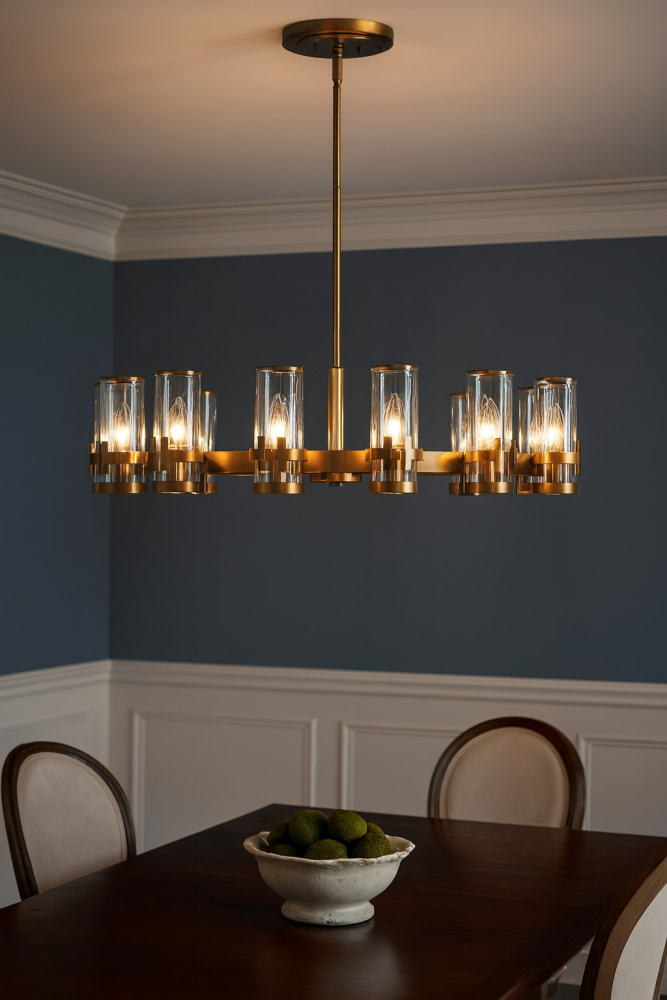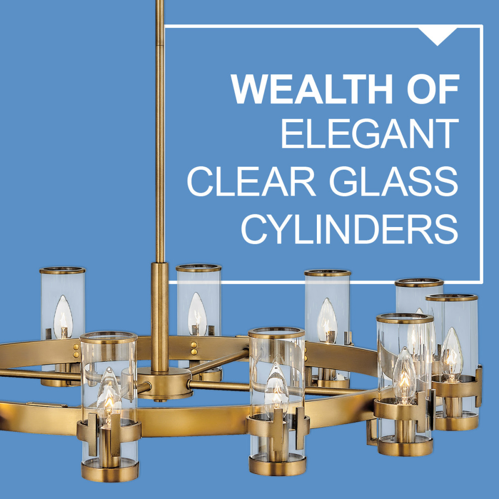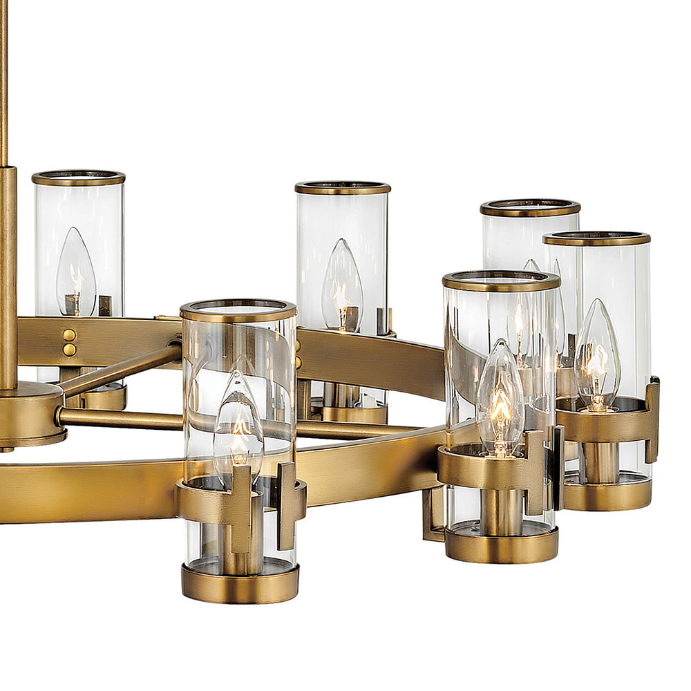 The Reeve chandelier balances sophistication with simplicity. The traditional low-profile silhouette is elevated by a wealth of elegant clear glass cylinders. Each glass is secured with a cast double-T bracelet matching the frame's luxurious finish with a corresponding metal band at the top.