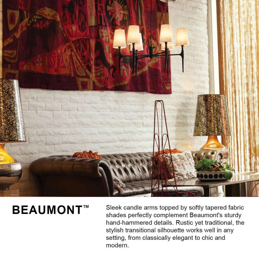 Sleek candle arms topped by softly tapered fabric shades perfectly complement Beaumont's sturdy hand-hammered details. Rustic yet traditional, the stylish transitional silhouette works well in any setting, from classically elegant to chic and modern.
