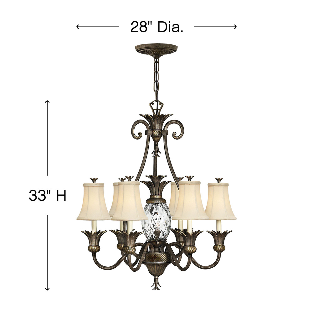A Hinkley classic, the ornate Plantation collection features exceptional pineapple shaped, clear optic glass that makes a noble statement. The elaborate, decorative cast detailing is accentuated by its lush finish.