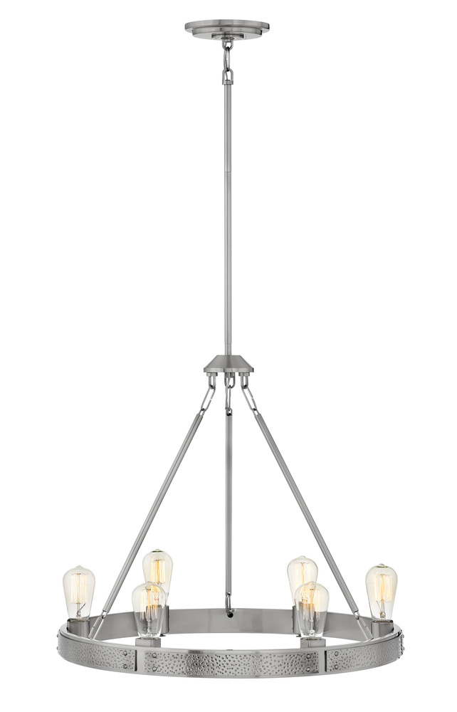 The striking hammered plates are a distinctive focal point in Everett’s design. Amplifying its unique look is the rich two-tone finish, imparting a refined elegance to this modern yet rustic chandelier. The use of vintage filament bulbs is recommended.