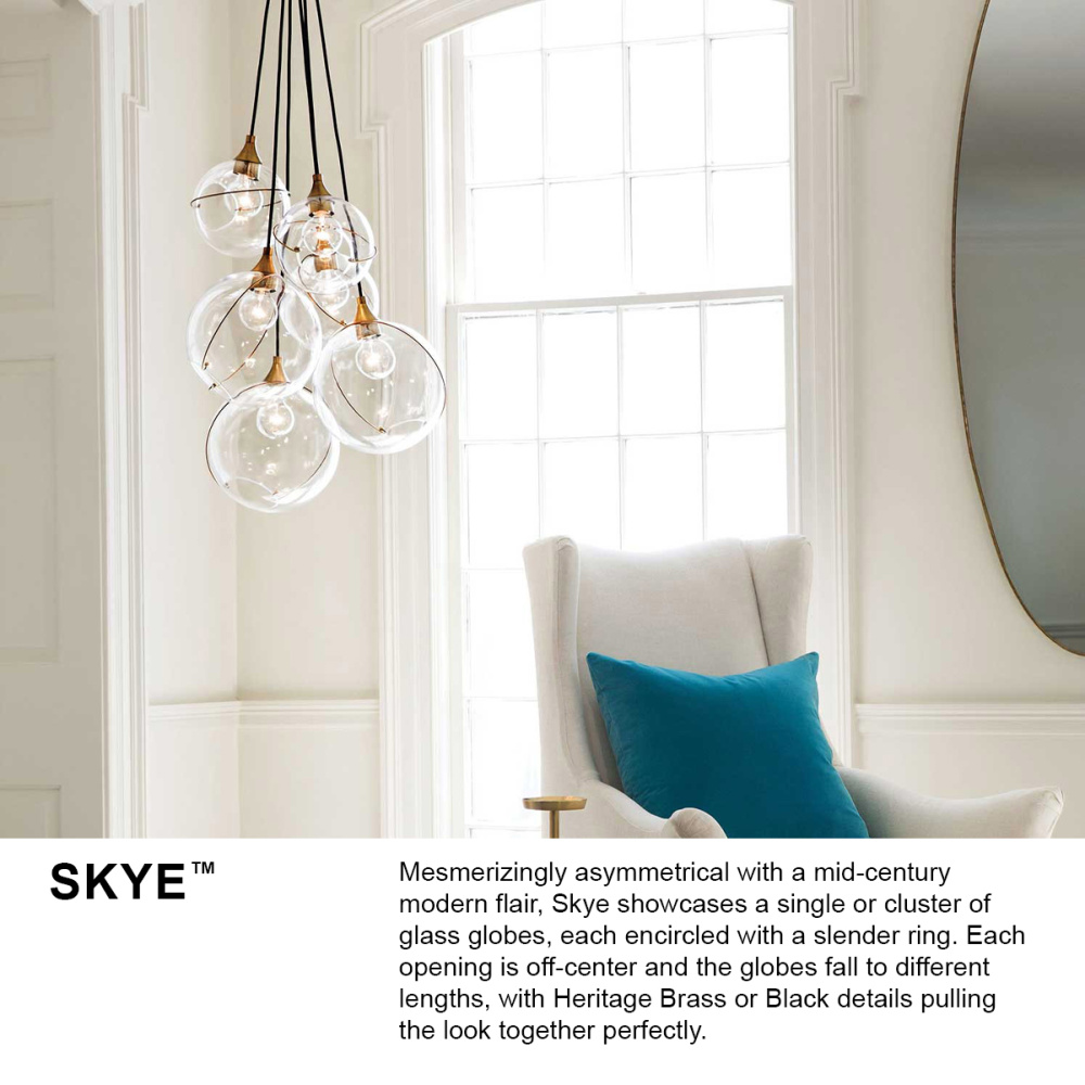Mesmerizingly asymmetrical with a mid-century modern flair, Skye showcases a single or cluster of glass globes, each encircled with a slender ring. Each opening is off-center and the globes fall to different lengths, with Heritage Brass or Black details pulling the look together perfectly.