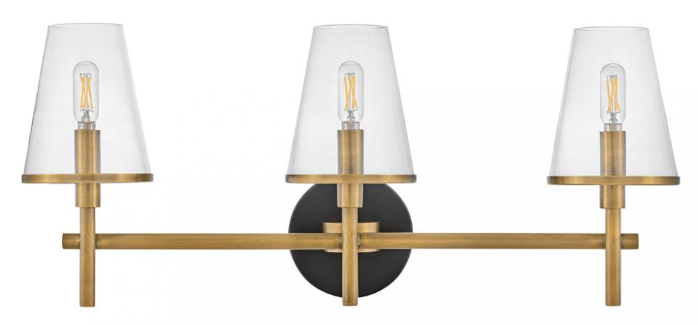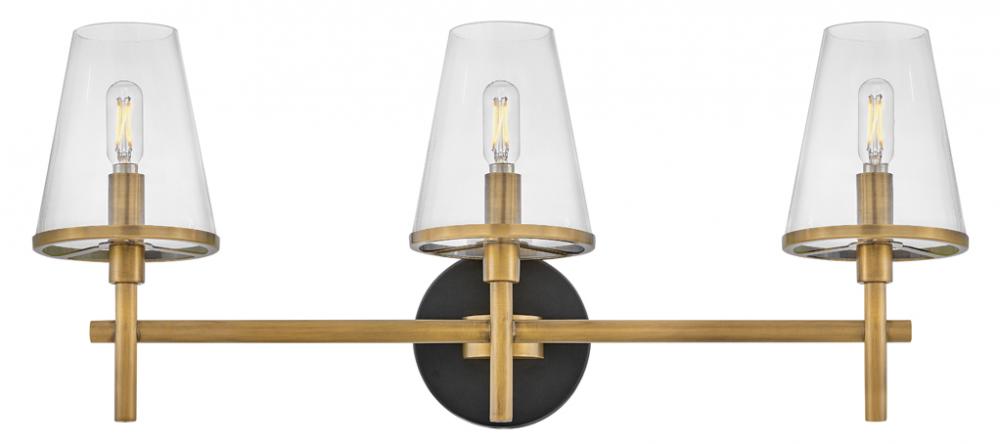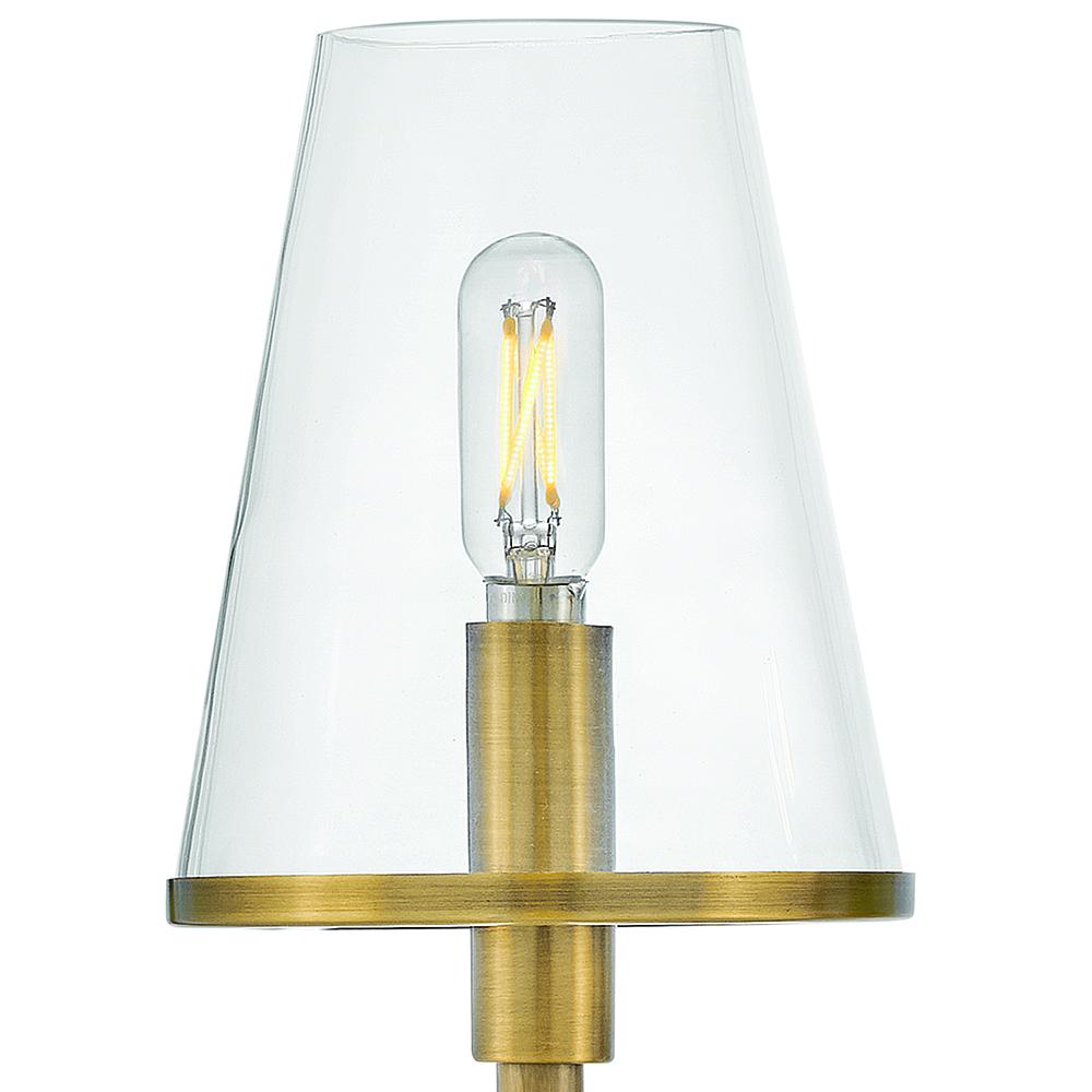 Marten has a clean, crisp look that brings striking transitional elements to any décor style. Clear glass shades have a Heritage Brass rim, perfectly complementing the Black back plate to tie the aesthetic together. The clean lines provide the satisfaction of balanced symmetry while giving off ample light.