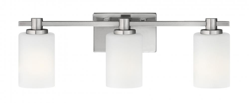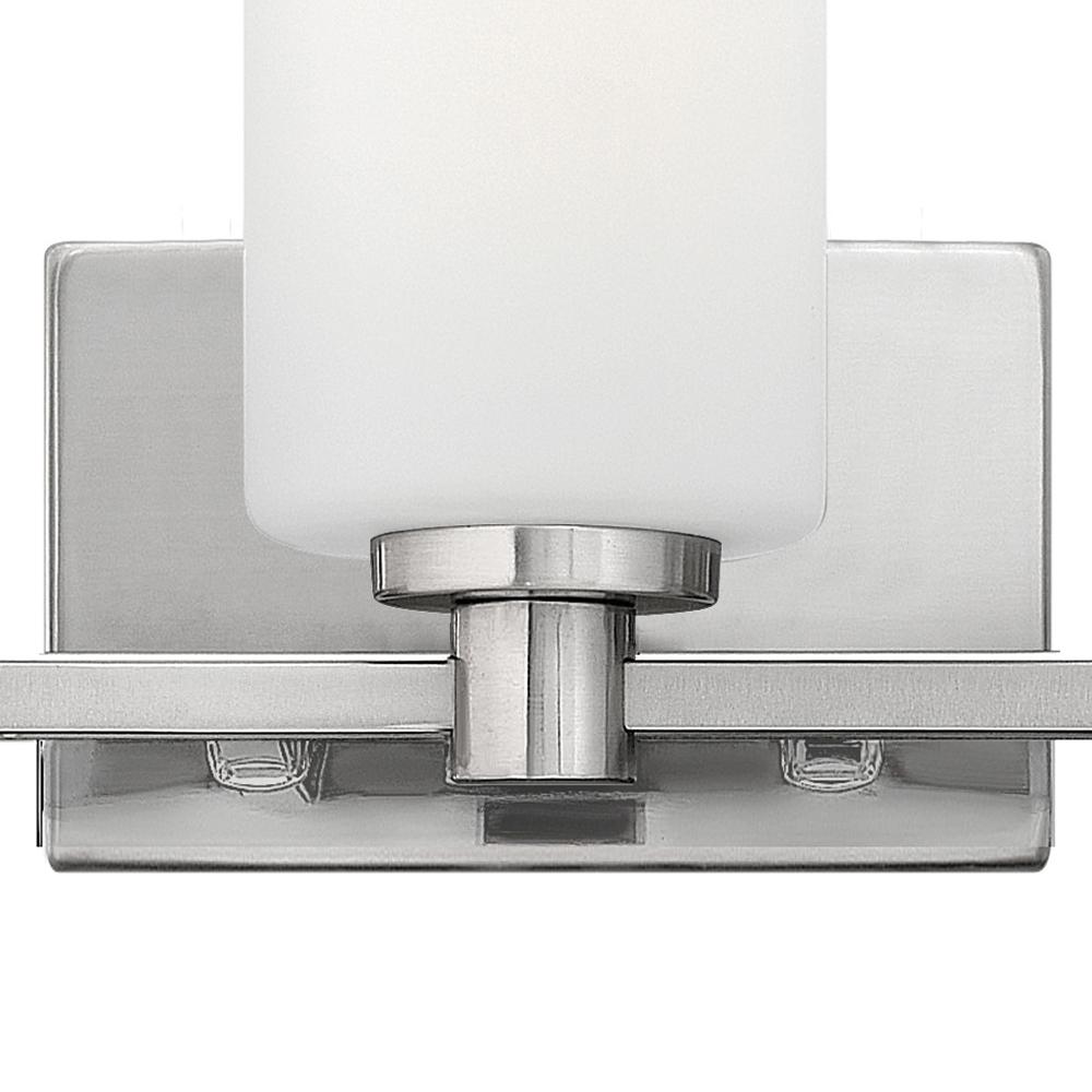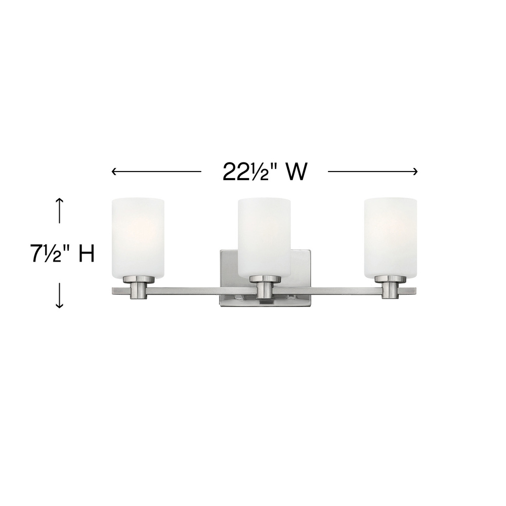 Karlie's clean design is transitional in style and will complement a variety of décor. Featuring precision die-cast cups and cylindrical, etched opal glass, it is available in Brushed Nickel and Chrome.